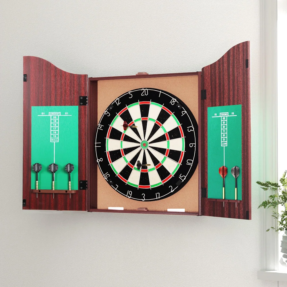 18" Sisal Dartboard and Wooden Cabinet Set with 6 Steel Darts, Rotating Score Ring, Staple-Free Divider, Brown