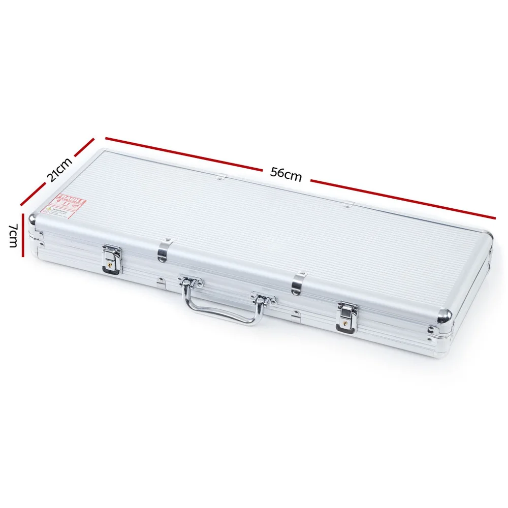 Elevate your poker nights with our 500pcs Poker Chips Set, perfect for Texas Hold-em and casino-style games. This premium set includes 500 weighted chips (100 each in black, blue, green, white, and red), two decks of cards, five red dice, and three game buttons, all housed in a stylish, lockable aluminium case. Crafted for authenticity with eco-friendly plastic and steel inserts, it's your go-to for unforgettable gambling parties.