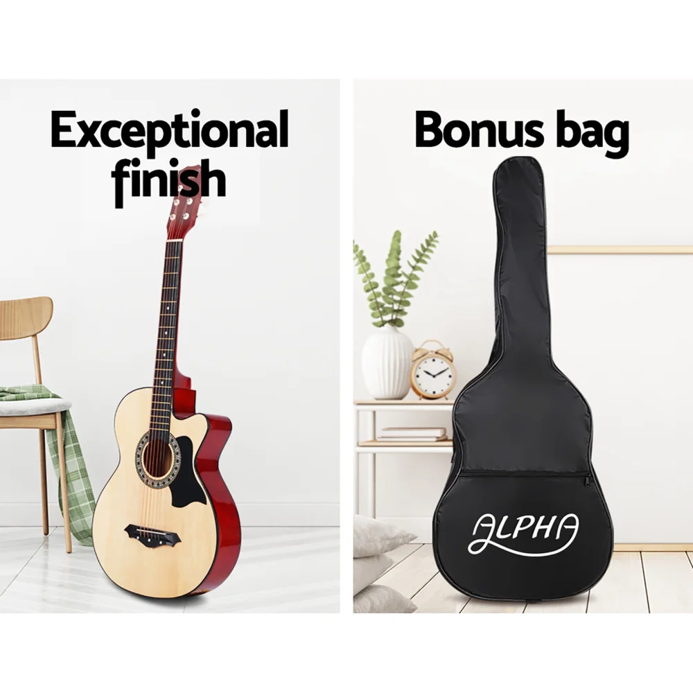 Alpha Acoustic Guitar, 38 Inch, Laminated Linden, Wood Finish, Steel Strings, Includes Stand, Strap, Bag, Capo, Picks