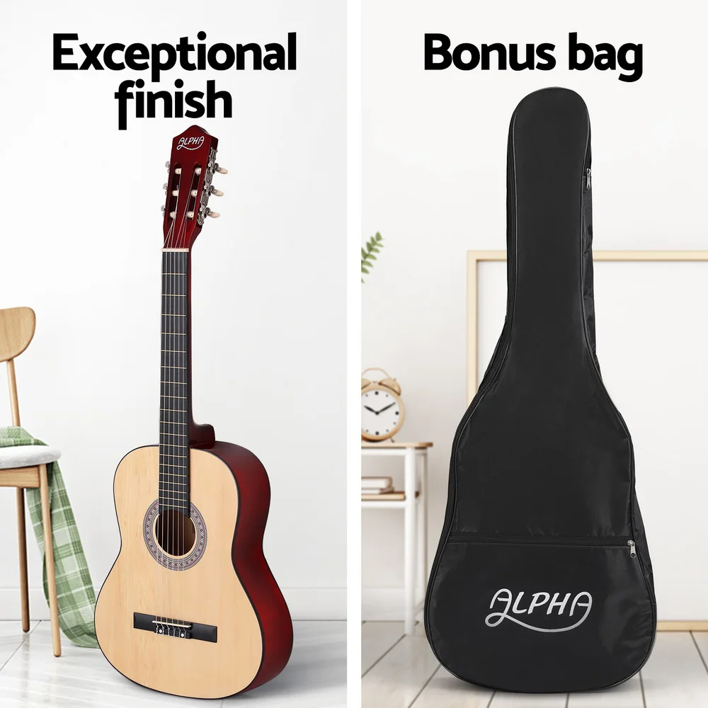 Alpha 39 Inch Classical Guitar, Wooden Body, Natural Color, Nylon Strings, Beginner Gift, Durable Carry Bag Included