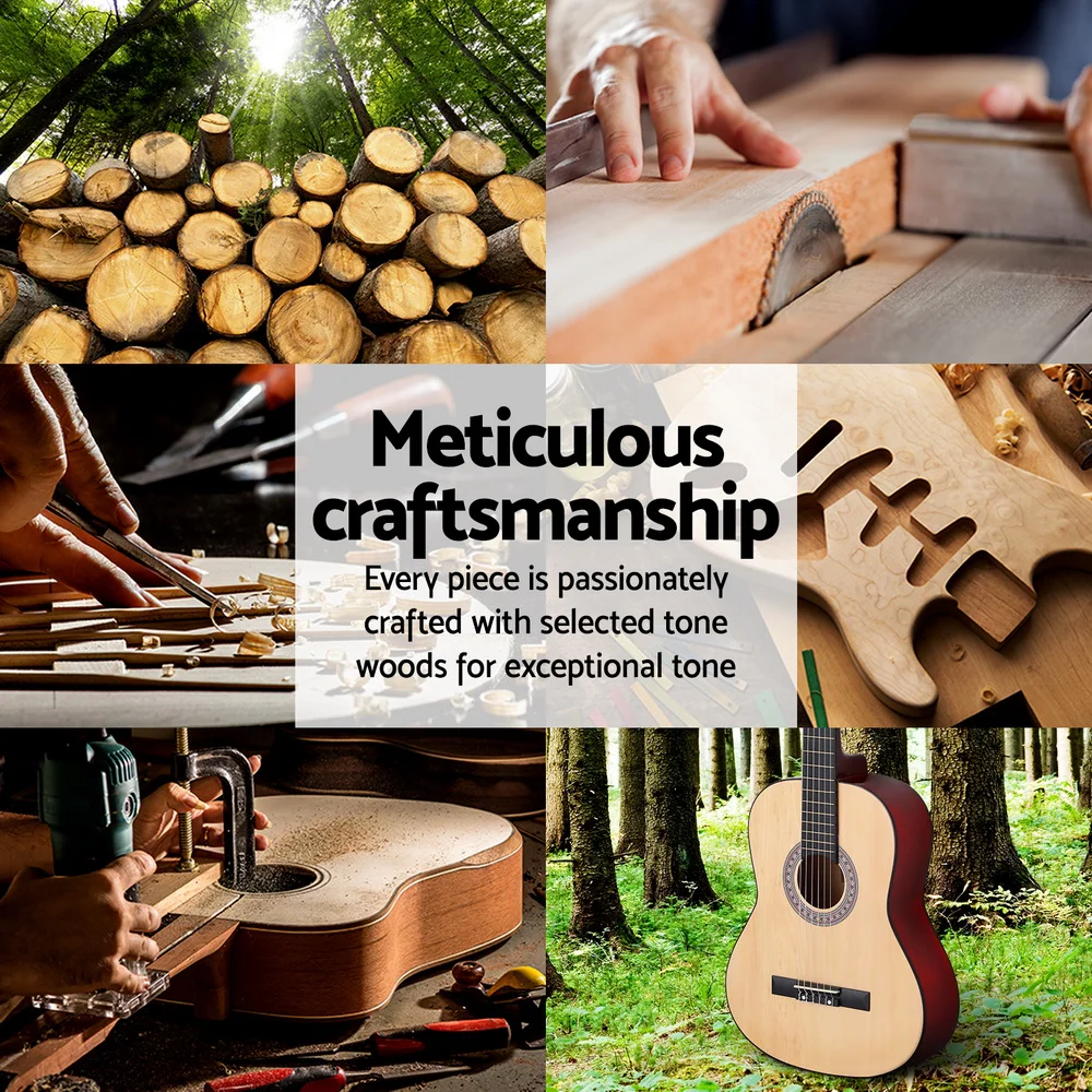 Experience the joy of music with the Alpha 39-Inch Classical Guitar. Perfect for beginners, this guitar offers easy handling and a rich sound, ideal for porch sessions or campfire sing-alongs. Crafted from laminated linden with an Okoume neck and plastic fingerboard, it ensures great tones and durability. With meticulous craftsmanship and a sleek lacquer finish, it's a delight to play. Comes with extra strings and a carry bag for convenience. Strum your way to harmony with Alpha!