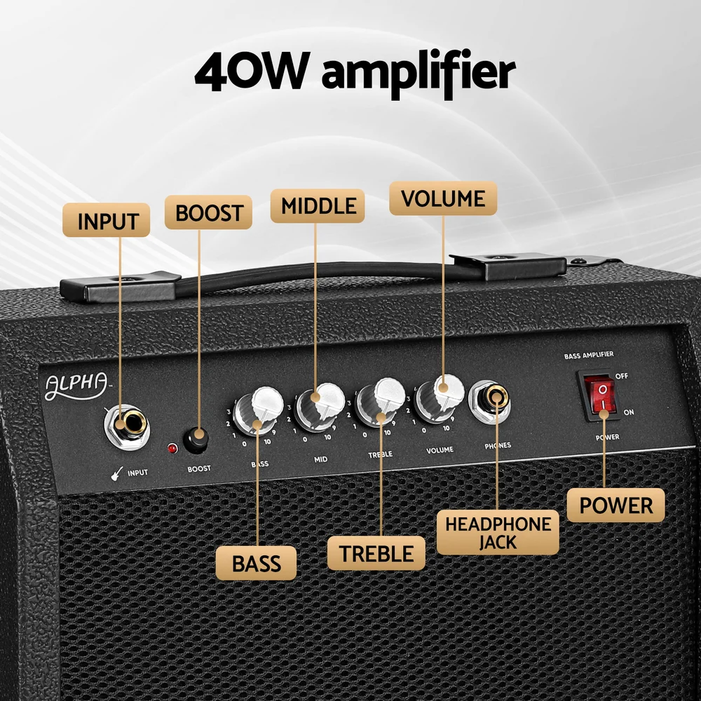 Alpha 40W Portable Bass Guitar Amplifier - Durable Black Case, Tone Control, Compact Design for Practise Sessions