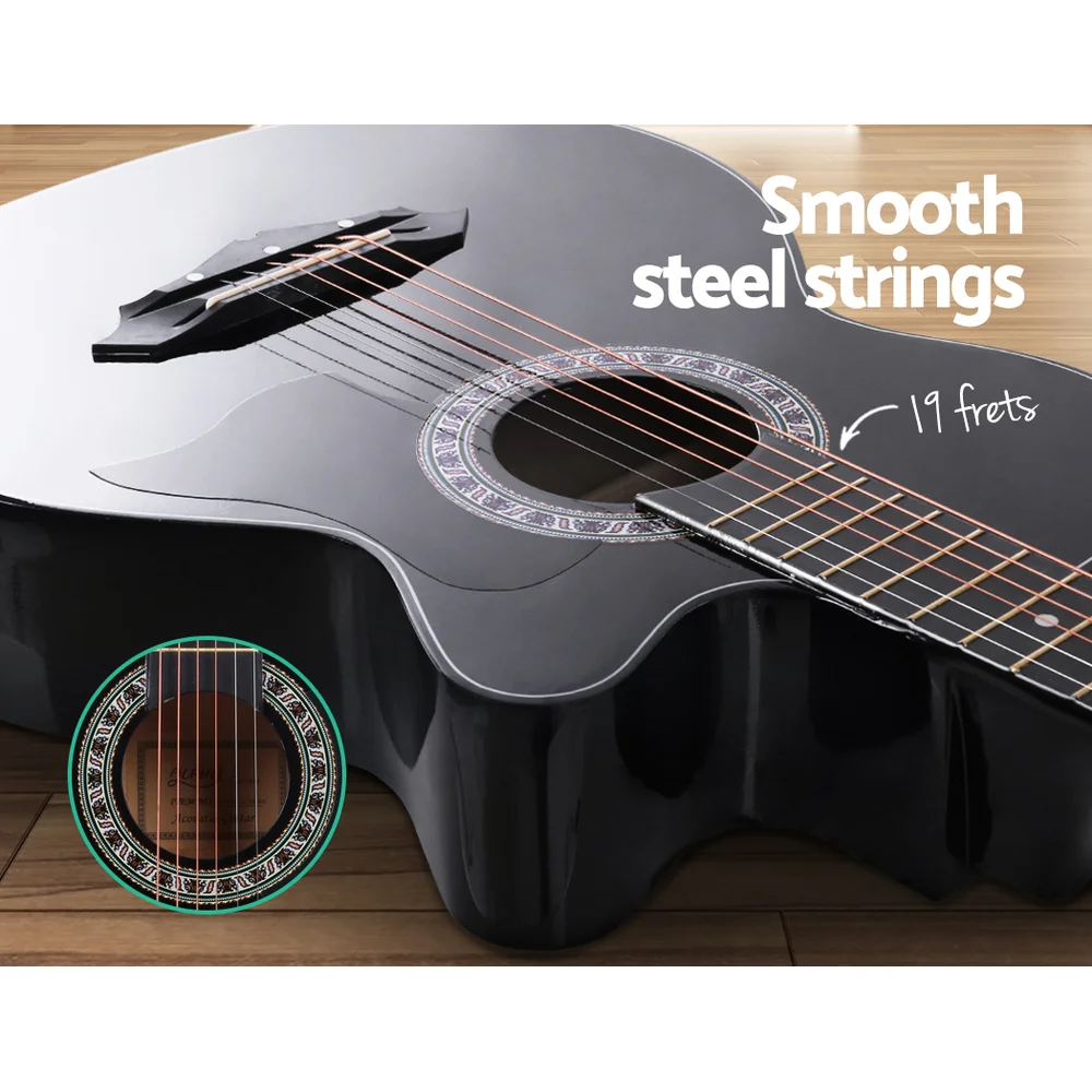 Alpha 38 Inch Acoustic Guitar, Laminated Linden, Black, Full Size Cutaway, Steel Strings, Includes Strap & Bag
