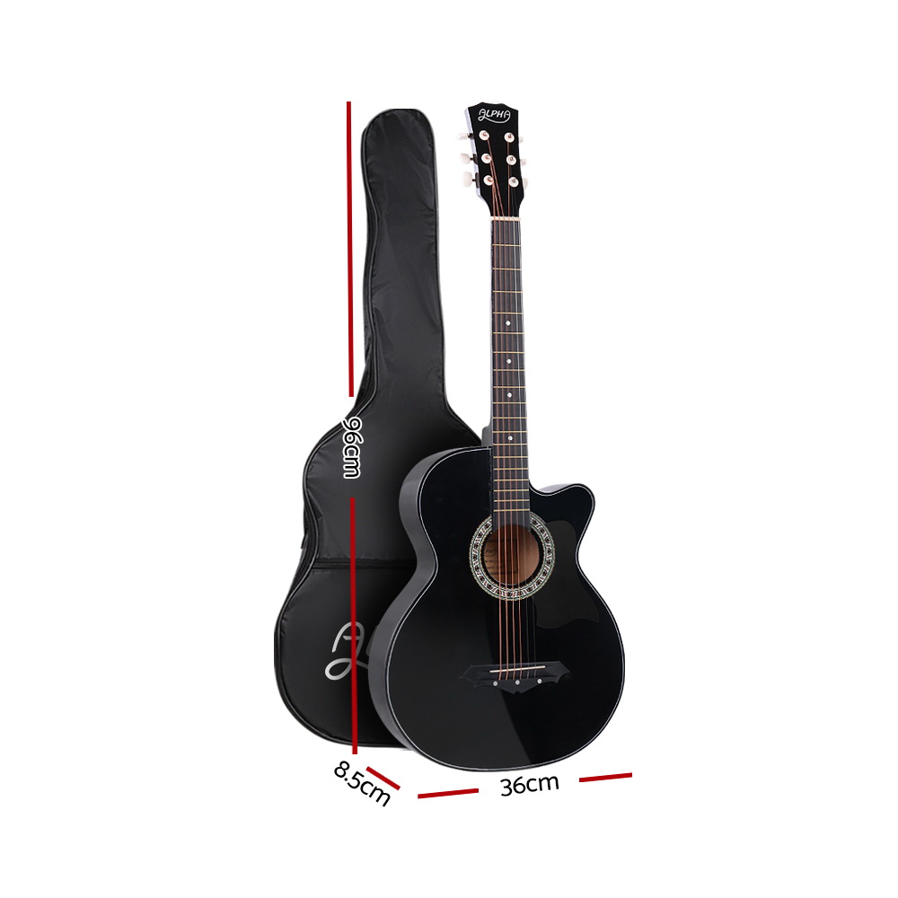 Alpha Acoustic Guitar, Laminated Linden, 38 Inch, Black, Steel Strings, Cutaway Design, Stand & Accessories Included