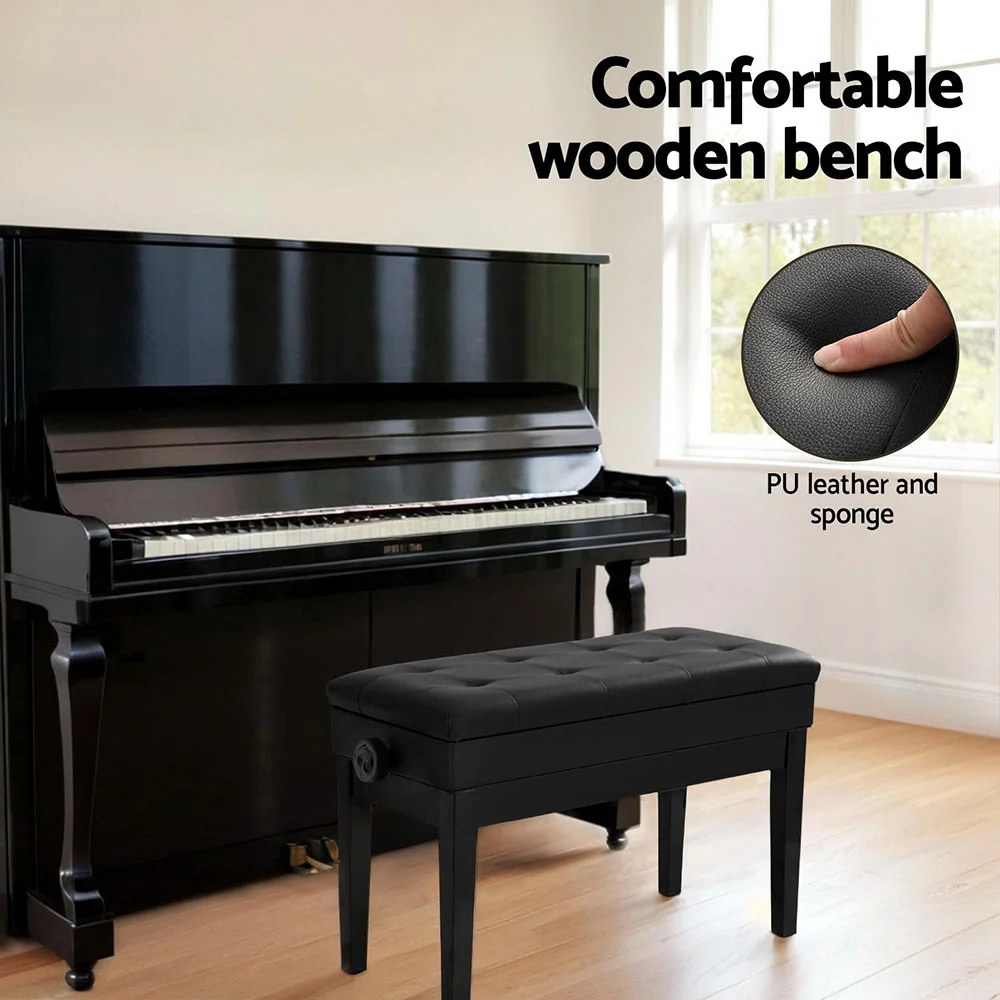 Alpha Adjustable Piano Bench Stool - Solid Oak, PU Leather, Storage, Anti-Slip Legs, 75x34x47cm, Black Finish