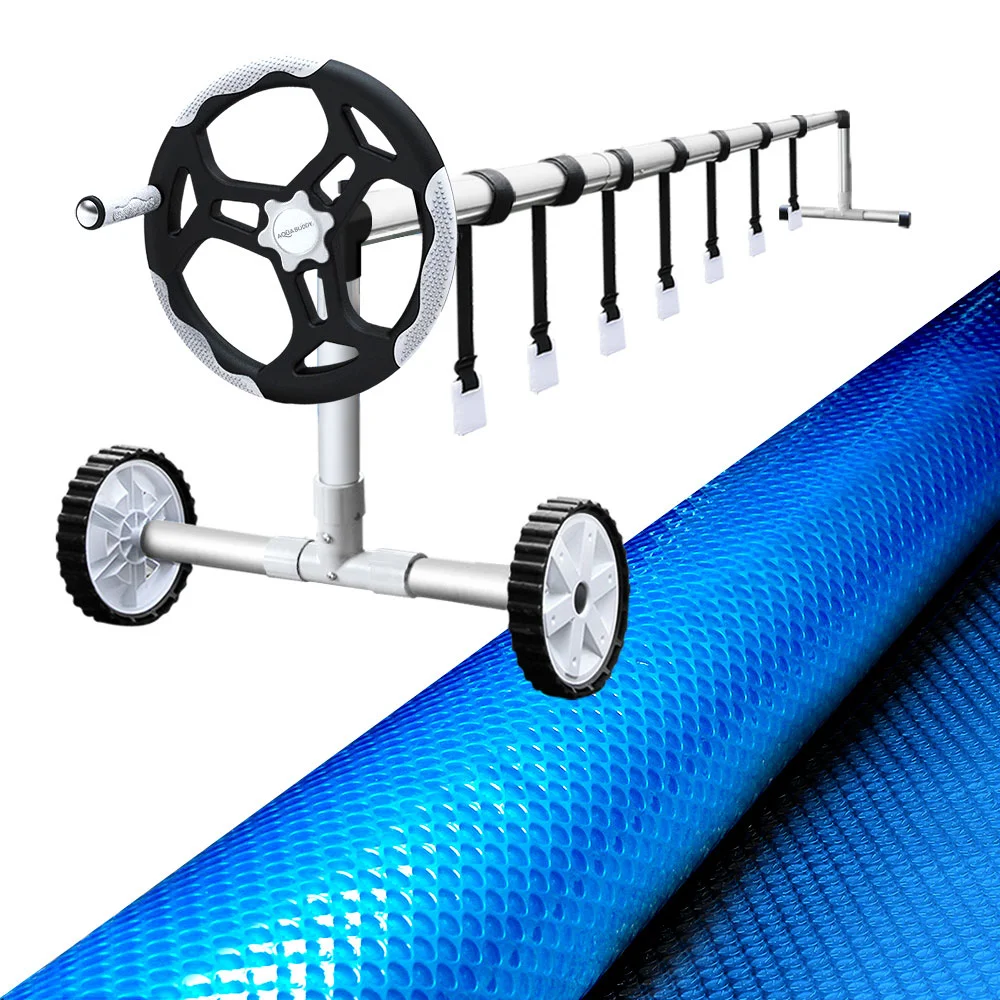 Aquabuddy Aluminium Pool Roller & 500 Micron Solar Cover 10.5x4.2m, Blue/Silver, Keeps Pool Warm & Clean