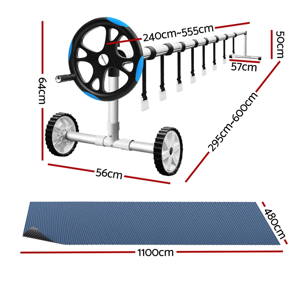 Keep your pool warmer, cleaner, and hassle-free with the Aquabuddy Pool Cover 600 Micron 11x4.8m w/ Roller 5.55m Black Solar Blanket. The adjustable aluminium roller fits pools 2.4m - 5.55m wide, ensuring smooth operation with telescopic poles and a low-friction crank. The 600-micron cover's blue top and black underside maximise heat absorption, reduce evaporation by up to 97%, and block debris, cutting down maintenance and saving on water, chemicals, and energy all year round.