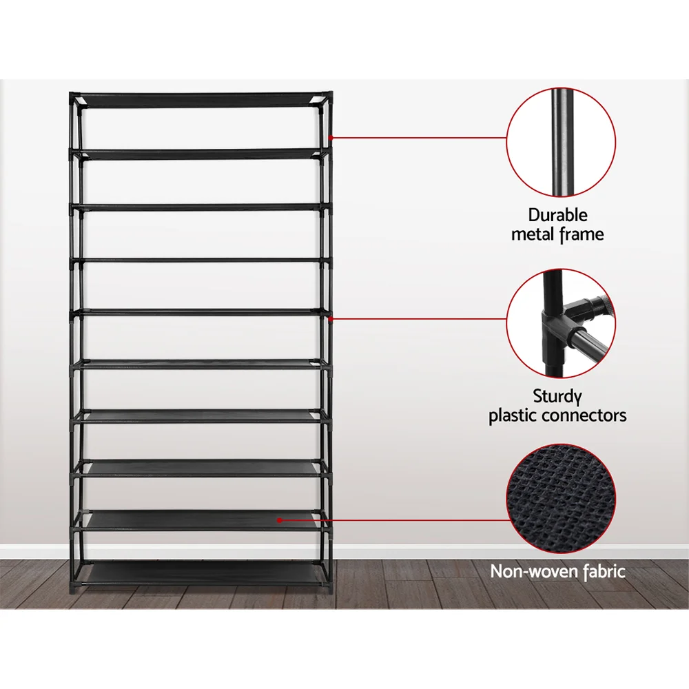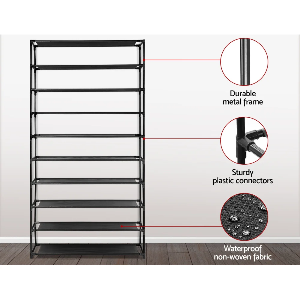 Maximise your footwear storage with the Artiss Shoe Rack Cabinet Stackable 50 Pairs 10-Tier in sleek black. This towering shoe rack offers a robust metal frame that can hold up to 50 pairs of shoes, depending on their size. The 10-tier design allows for maximum organisation, while removable panels accommodate all types of footwear, from boots to sandals. Its stackable nature lets you tailor the rack to fit your space, creating either multiple smaller racks or one impressive tall structure. Non-slip foot pads ensure stability, and the included non-woven fabric can be trimmed to fit each tier. Enjoy tool-free assembly and a versatile design that transforms your shoe storage.
