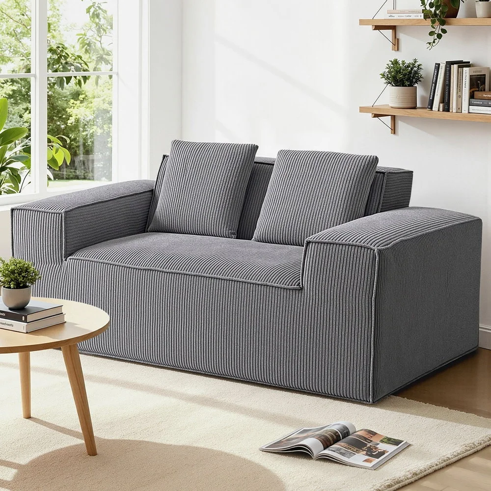 Artiss 2 Seater Corduroy Loveseat Sofa Bed - No Assembly, High-Density Foam, Pocket Spring, Grey, Bonus Cushions