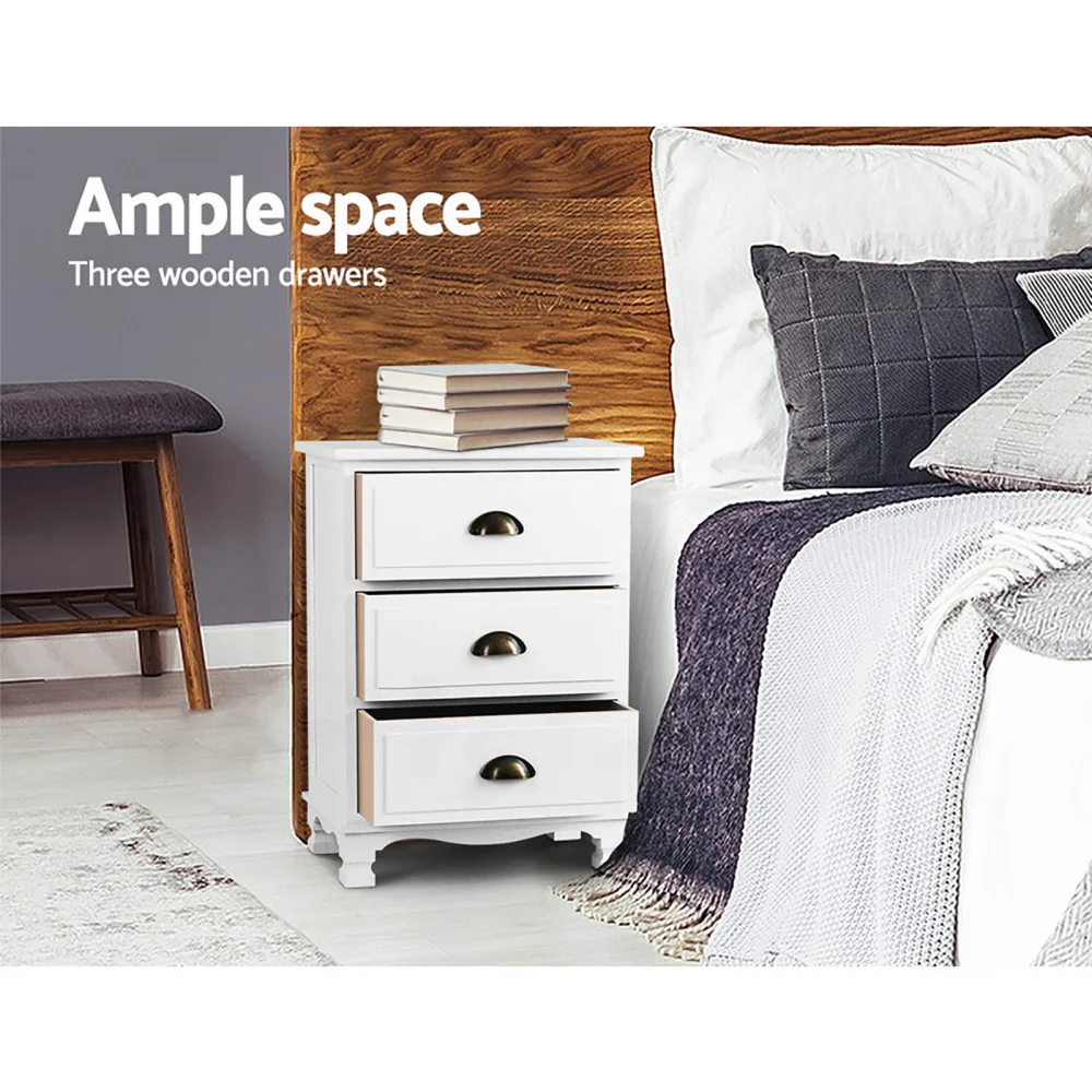 Bring timeless elegance to your bedroom with the Artiss 2x Bedside Table 3 Drawers Vintage - THYME White. Crafted from solid Paulownia wood and finished in classic white, these cabinets blend retro charm with modern practicality. Each of the three deep drawers features vintage metal handles, providing ample, anti-slip storage. Safety is ensured with round corners, anti-scratch feet pads, and an included wall mount. Delivered fully assembled and easy to clean, these durable bedside tables are as functional as they are stylish.