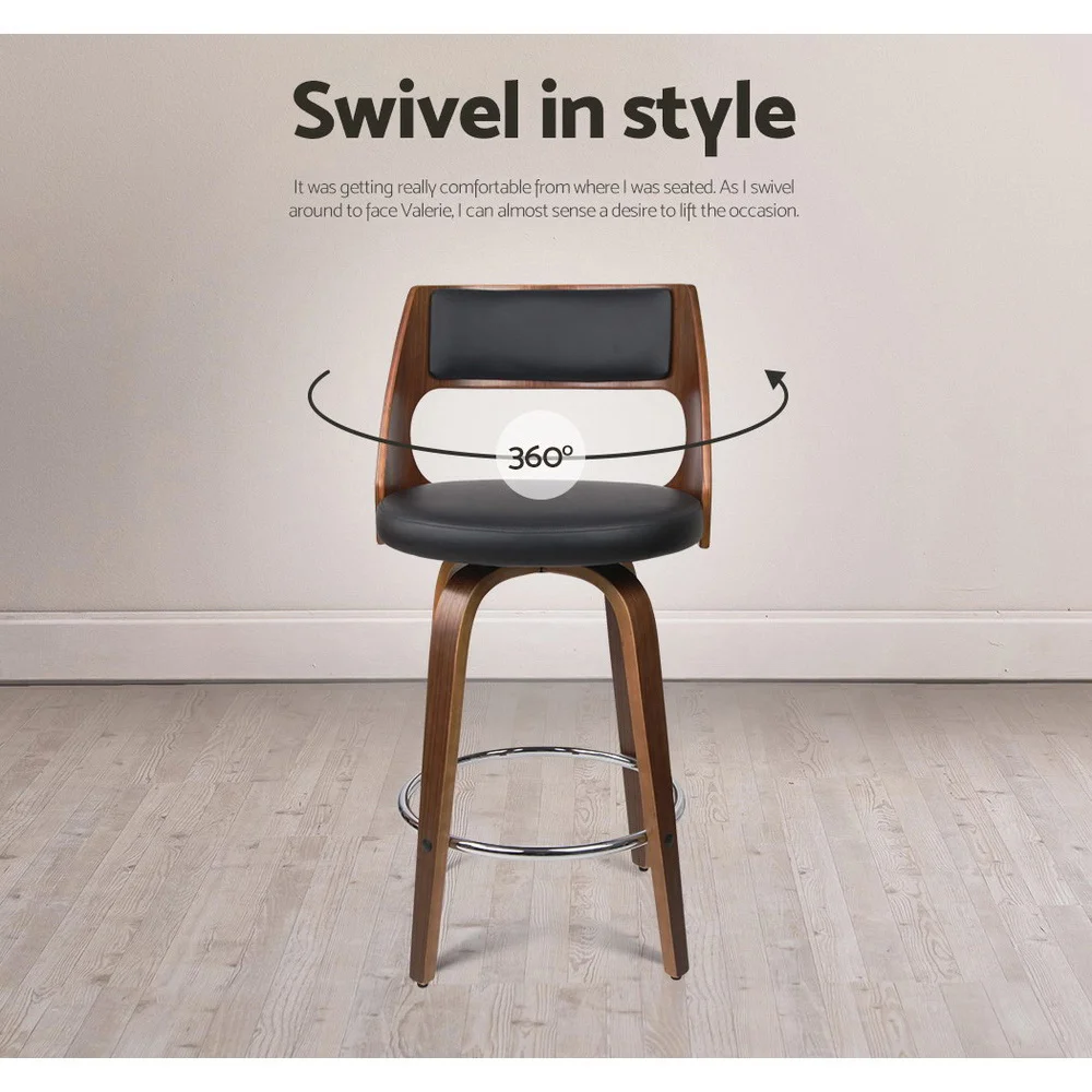 Artiss 2x Swivel Bar Stools - 76cm PU Leather, Solid Wood, Chrome Footrest, Contoured Backrest, Anti-Slip Feet, Black