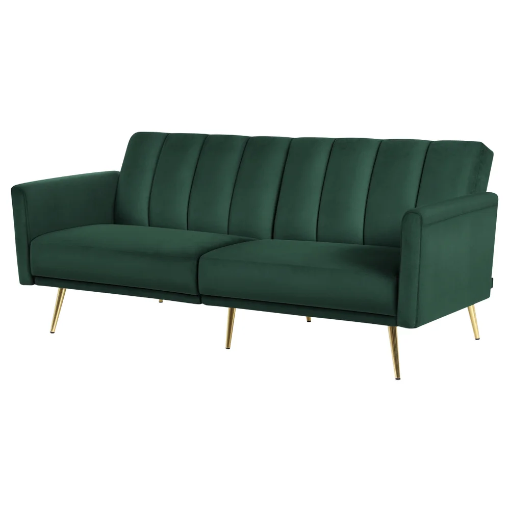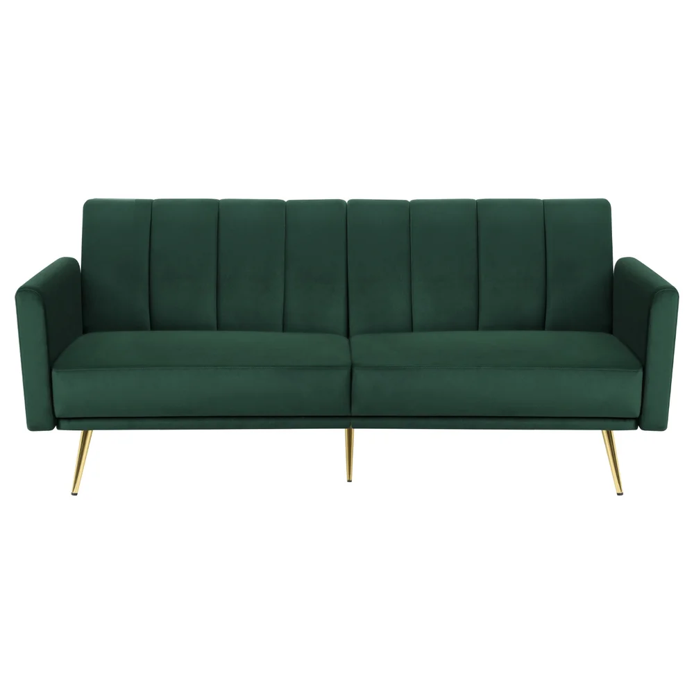 Upgrade your living space with the Artiss 3-Seater Sofa Bed, a stylish blend of comfort and versatility. Featuring premium velvet upholstery in green and gold, this convertible lounge boasts a modern vertical stripe pattern, adjustable armrests, and three backrest positions for tailored relaxation. High-resilience foam cushions, a sturdy plywood frame, and metal legs ensure durability and support up to 300kg. Easy to assemble and equipped with non-slip floor protectors, its ideal for small spaces or guest rooms. Includes a 1-year warranty.