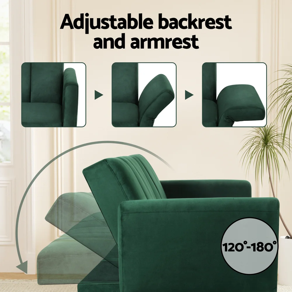 Artiss 3 Seater Velvet Sofa Bed Couch, Convertible Lounge, Adjustable Arm Recliner, Modern Green, 207cm, 300kg