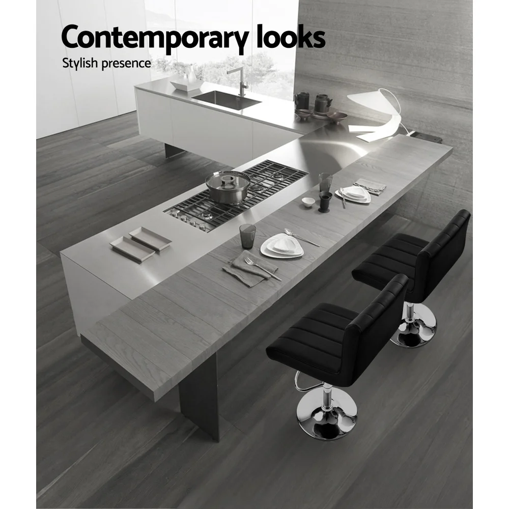 Experience ultimate comfort and style with the Artiss 4x Bar Stools in sleek black. Perfect for any modern home, these stools feature a classic design with premium PU leather upholstery and extra thick foam padding. The contoured backrest adds elegance, while the 360-degree swivel seat and adjustable height via SGS-tested gas lift ensure practicality. The corrosion-resistant chrome finish, semi-circular footrest, and protective base keep your floors scratch-free, making these stools both functional and stylish.