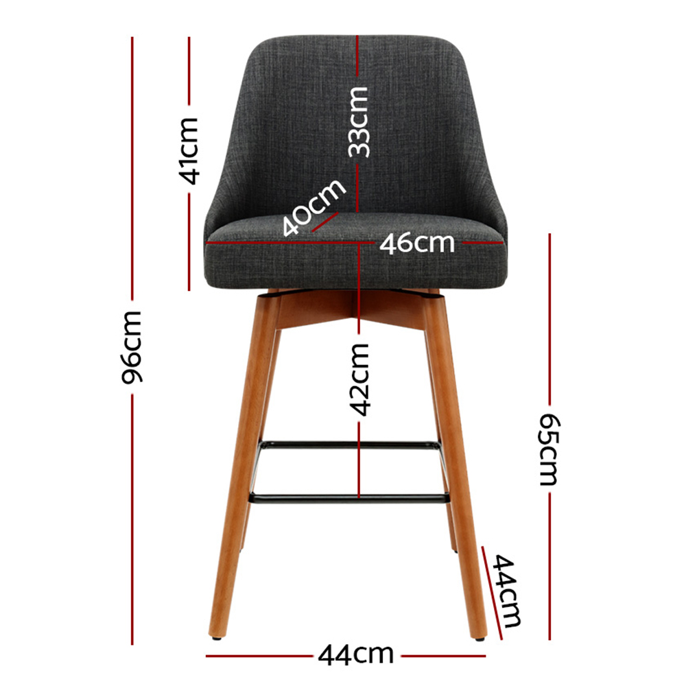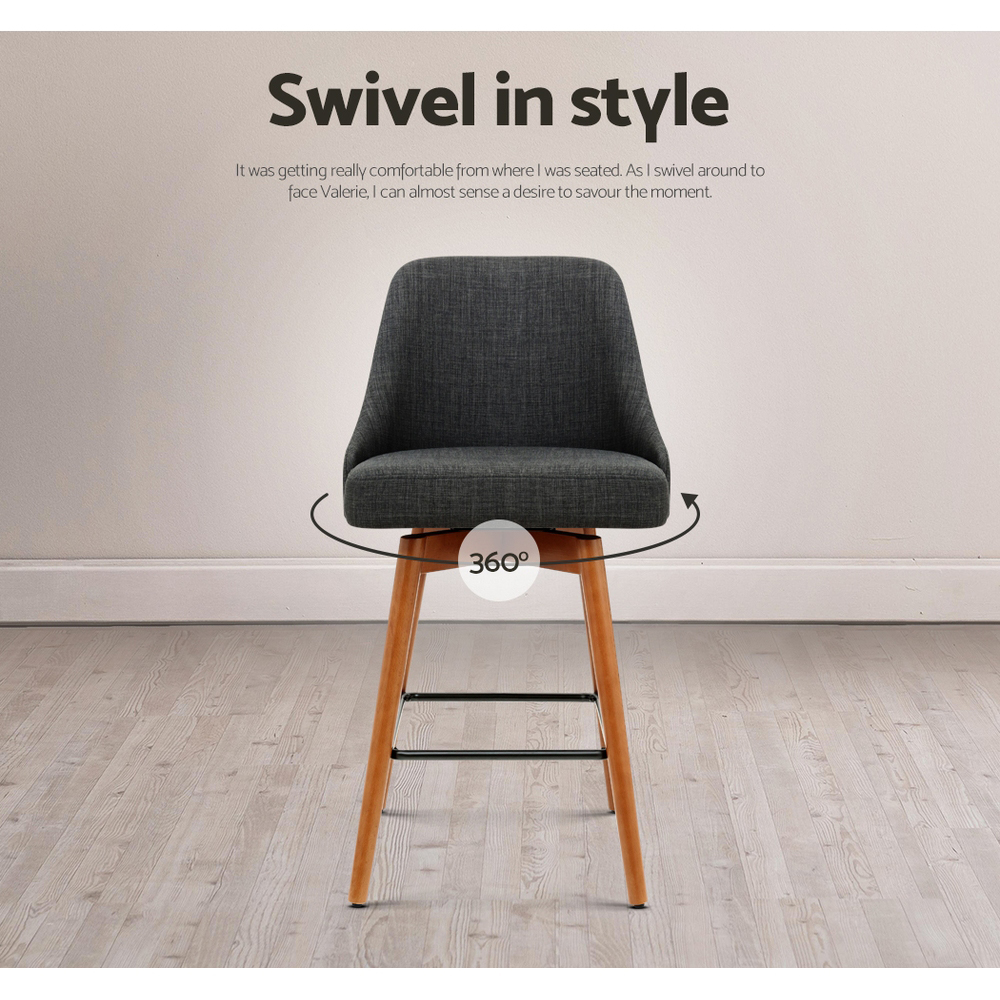 Elevate your home bar or kitchen with the Artiss 4x Bar Stools Swivel Seat in Wooden Charcoal. Crafted with solid plywood and upholstered in premium faux linen, these stools blend wood, metal, and fabric for sophisticated style and comfort. The thickly padded seat and mid-height backrest provide ample support, while the powder-coated steel footrest and anti-slip floor protectors ensure stability and protect your floors. Add a harmonious touch of modern elegance and comfort to any space with Artiss.