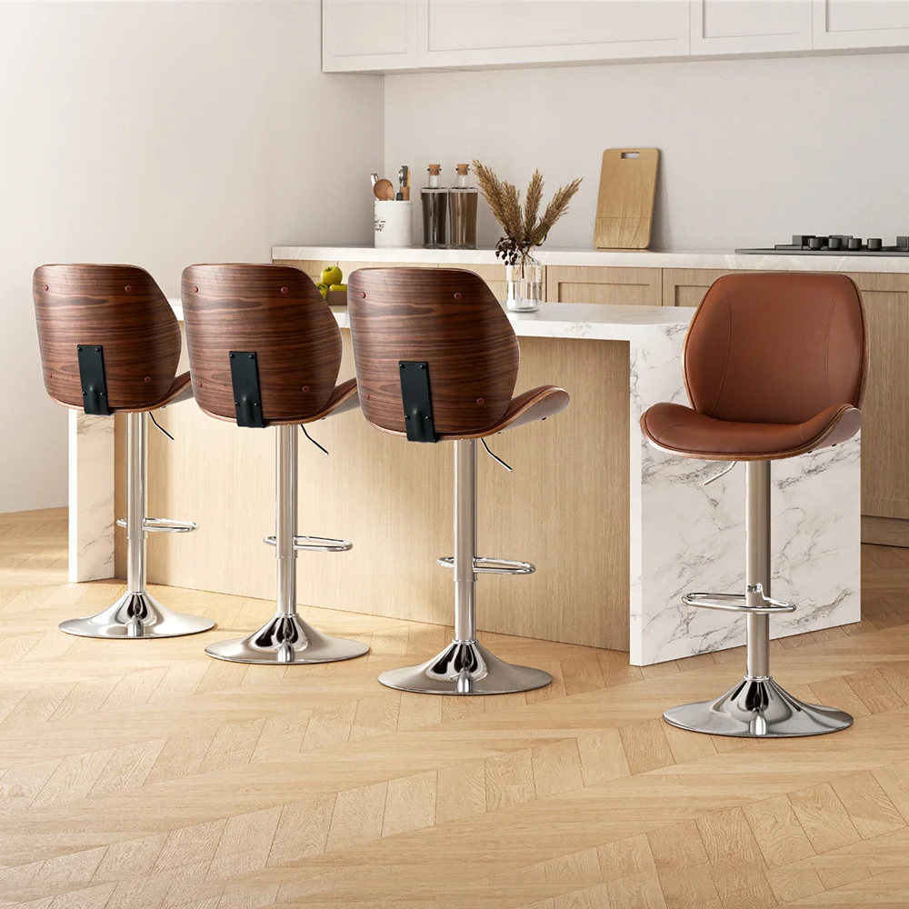 Artiss 4X Bar Stools: Adjustable Bentwood Kitchen Chairs with Brown PU Leather, 150kg Capacity, Anti-Slip Protectors