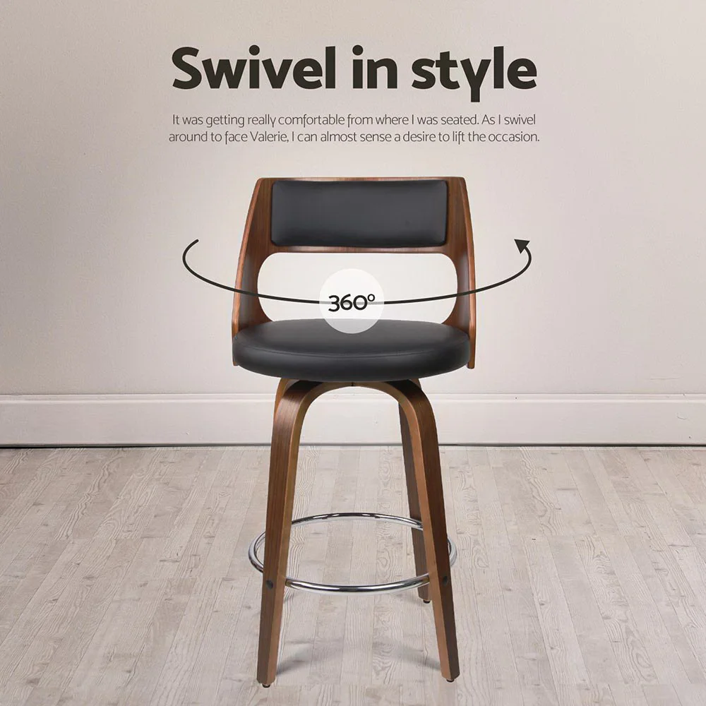 Artiss 4x 65cm Swivel Bar Stools Bentwood Walnut PU Leather Seat with Backrest and Chrome Footrest Black