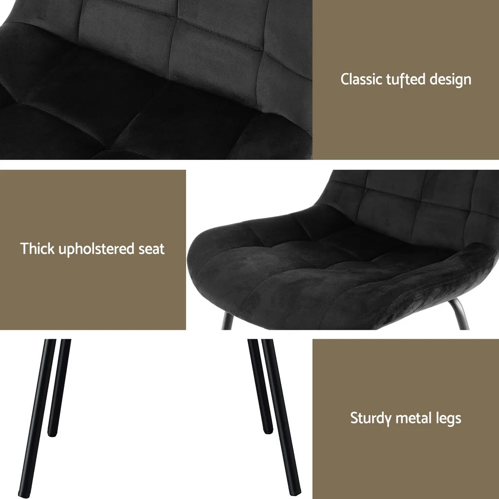 Add a touch of luxury to your space with the Artiss 4x Dining Chairs. These elegant chairs, upholstered in soft black velvet, feature a sophisticated grid tufted pattern that enhances any room's ambience. Designed for comfort and style, their ergonomic curved back offers superb support, while the generously padded seat ensures hours of comfort. Supported by sleek metal legs, these chairs offer both stability and a modern aesthetic, making them perfect for dining rooms, lounges, or as chic accents. With simple assembly and easy maintenance, these versatile chairs are the perfect addition to elevate your interior decor.