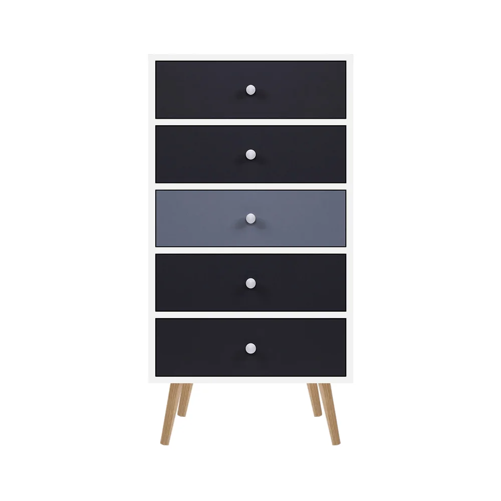 Embrace subtle style with the Artiss 5 Chest of Drawers - BONDS White. This Scandinavian-inspired tallboy boasts a chic two-tone design, crafted from quality particle board with a smooth paper veneer finish. Its five spacious drawers offer ample storage, while splayed legs and classic knob handles add charm. Enjoy smooth, hassle-free use with anti-rust metal slides. Perfect for any room, visualize it in your space using our 3D augmented reality feature. Assembly is easy with the included manual.