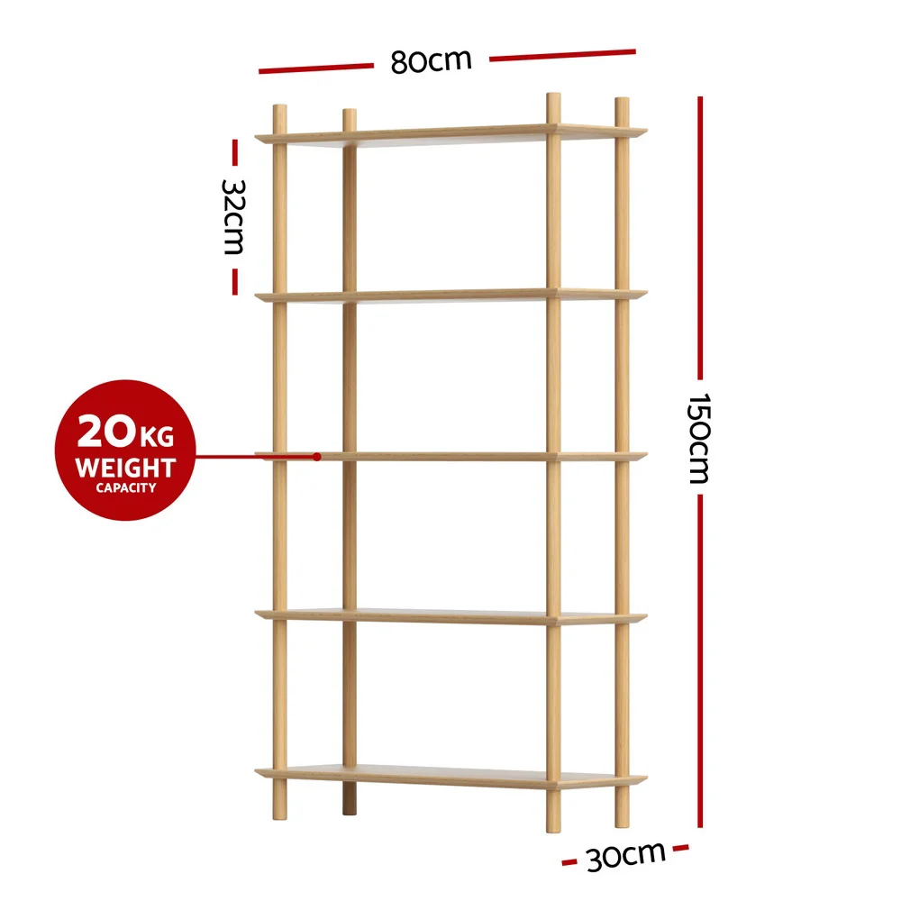 Artiss 5-Tier Wooden Bookshelf Display – 15mm MDF, Pine Legs, 80x30x150cm, 20kg Capacity, Anti-Tip Safety,