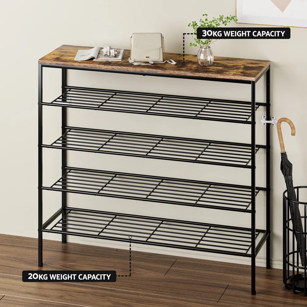 The industrial-style Artiss Bob Shoe Rack will help you keep your home neat and tidy without compromising on style. With its sturdy metal frame and smooth, clean surface, this rack ensures your daily essentials are always at hand. The tabletop, featuring a dark walnut wood grain, blends seamlessly with most interiors. Its five tiers of open shelves, designed to prevent dampness and mildew, can store up to 25 pairs of shoes, perfect for organising the whole family. Assembly is simple, making clutter-free hallways a reality. Enjoy a 1-year warranty for peace of mind.