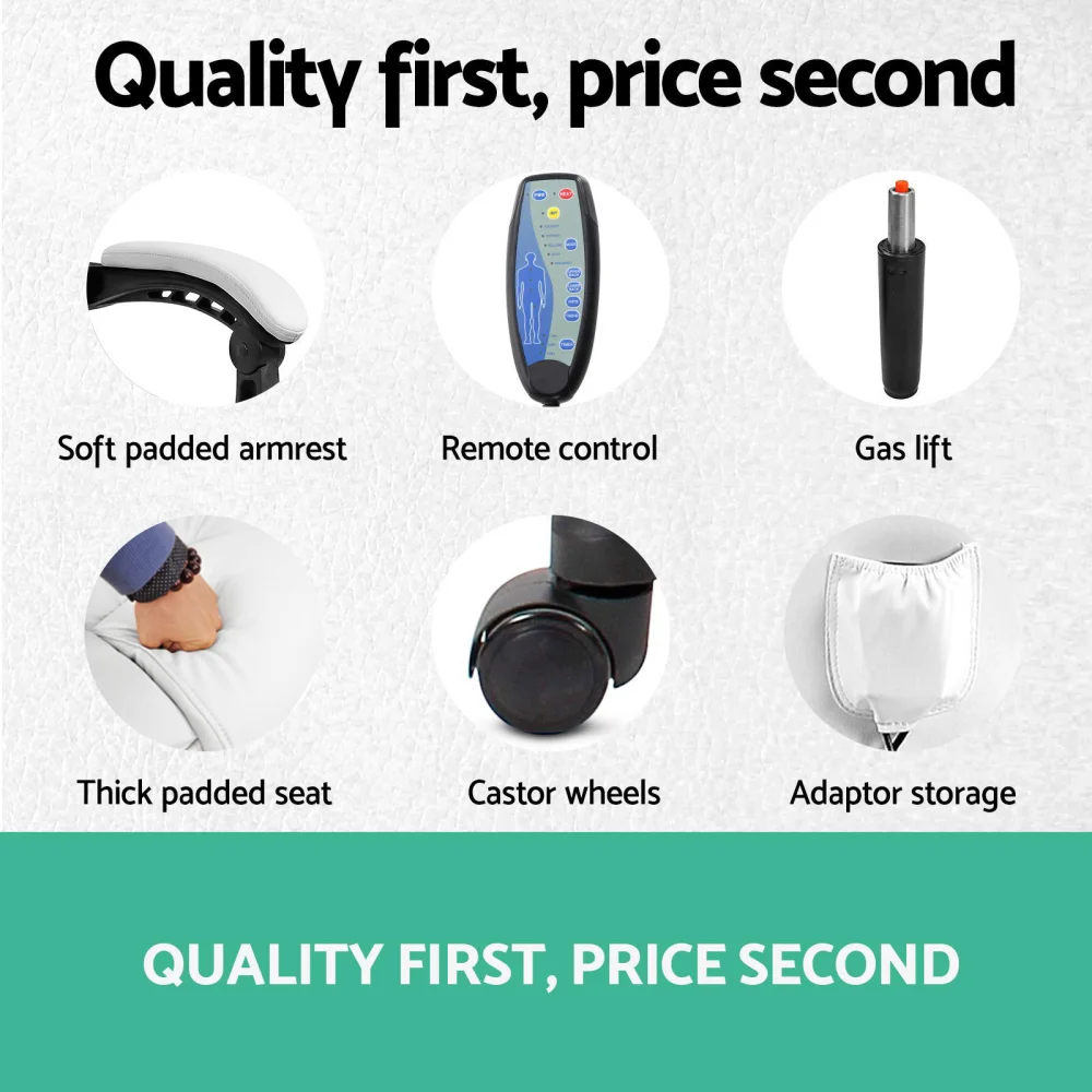 Experience the ultimate in workplace relaxation with the Artiss 8 Point Massage Office Chair in elegant white PU leather. This high-back chair not only offers exceptional ergonomic support with its S-shape contoured design, padded headrest, and armrests but also features a heated seat and an eight-point vibration massage system. Targeting your upper and lower back, hips, and thighs, the chair offers five massage modes and four intensity levels, all controlled via a convenient remote. With adjustable recline, swivel, and height functions, plus a timer setting for 15, 30, or 60-minute sessions, comfort is assured.