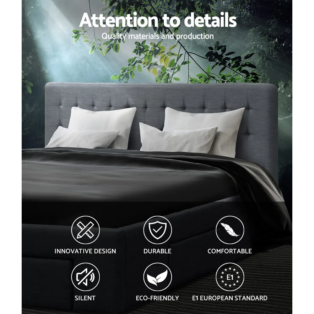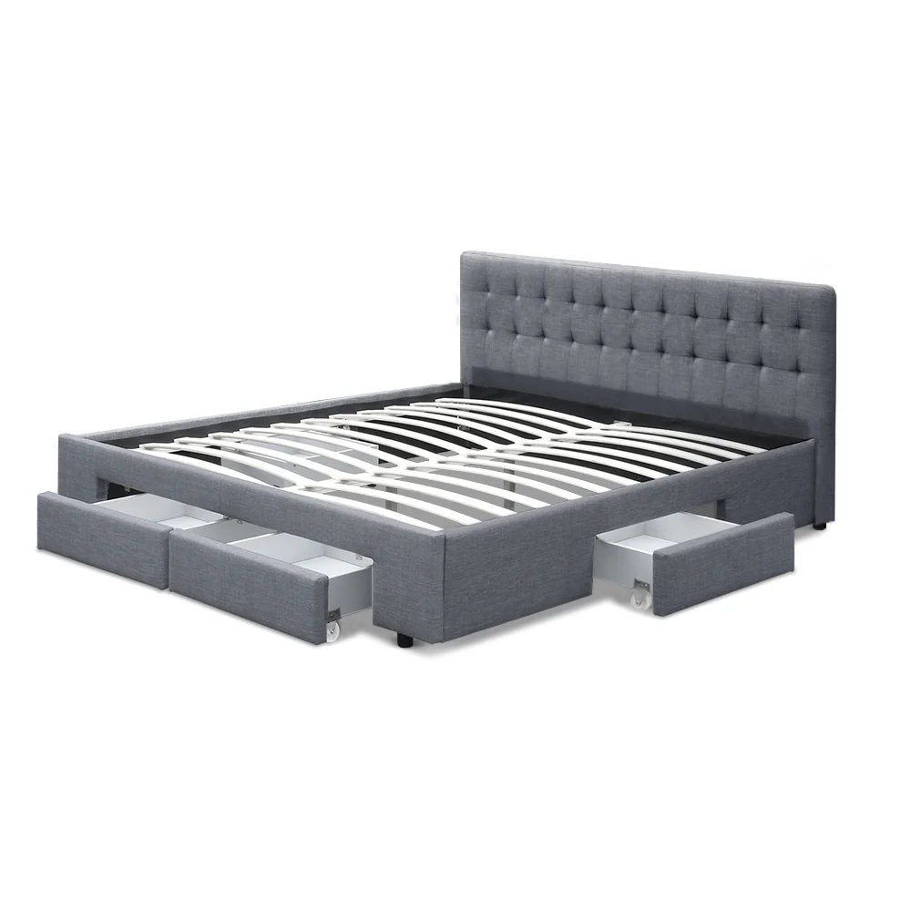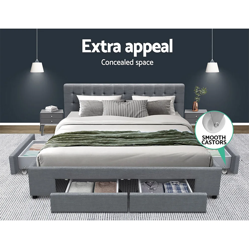 Artiss Avio Bed Frame King Size Grey with 4 Storage Drawers, Tufted Headboard, Linen Fabric, Steel Frame, 216cm