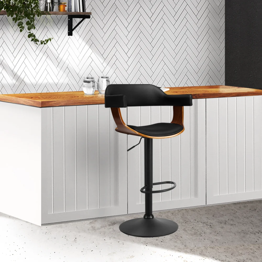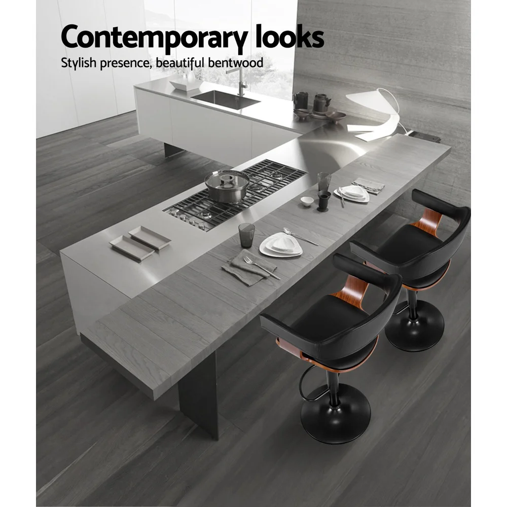 Artiss Quilla Bar Stool Black PU Leather and Bentwood, Adjustable Gas Lift Swivel Kitchen Dining Chair 56-78cm