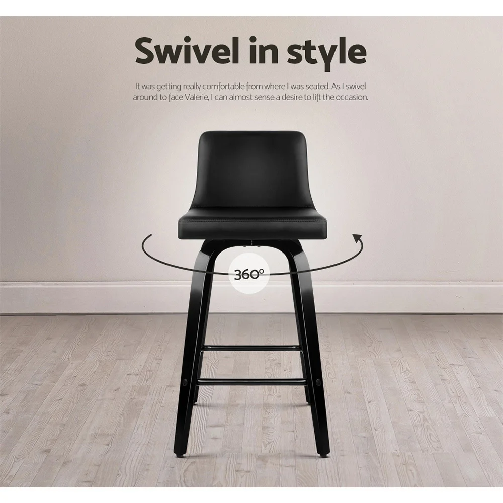 Elevate your space with the Artiss Felipe Bar Stools, where wood, metal, and deluxe PU leather unite in a stunning design. Crafted with solid plywood in a sophisticated black finish, these Bentwood Bar Stools feature a 360-degree swivel seat and a wide backrest for ultimate comfort and style. The 6cm thick padded seat and mid-height curved backrest provide excellent support, while anti-slip rubber feet ensure stability. Complete with a chrome steel footrest, these stools are perfect for any home, office, bar, or café. Embrace creative flair with the Felipe Bar Stools—get yours today!