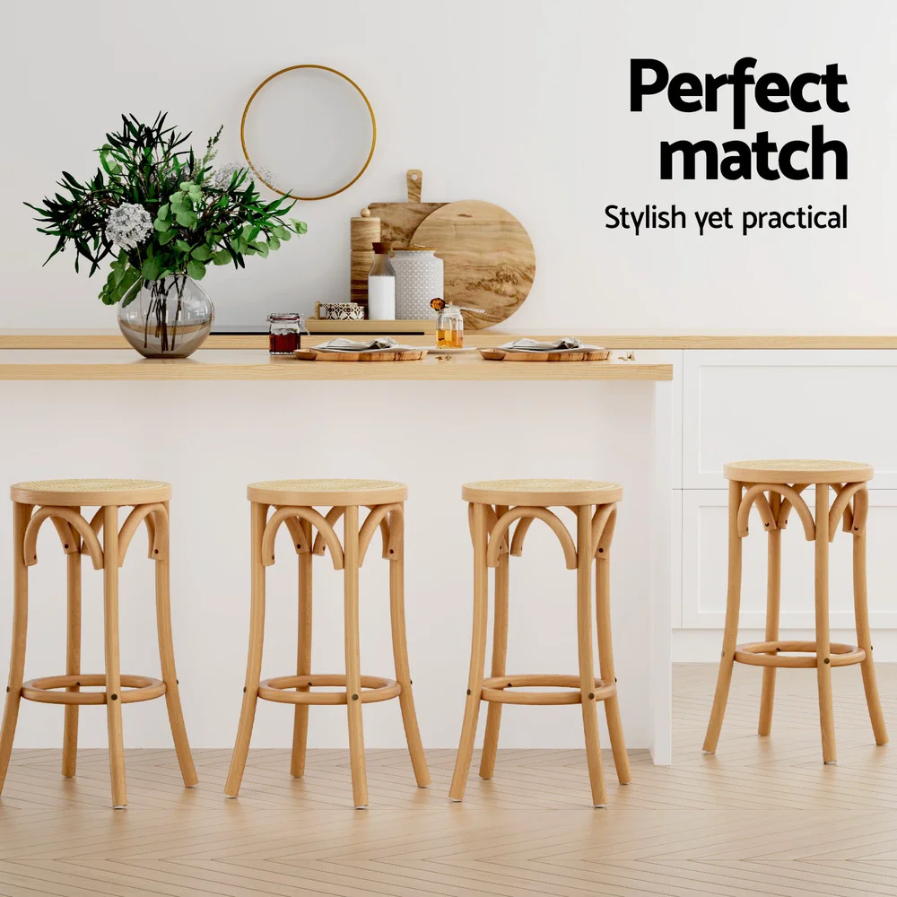 Enhance your space with the Artiss 4x Bar Stools featuring a classic rattan seat and solid beechwood frame. Perfect for any home, restaurant, or bar, these stools combine style and comfort with a natural, organic feel. The sturdy design supports up to 150kg, with a smooth finish, rounded edges, and anti-slip feet ensuring stability. Easy to assemble and maintain, these stools are a timeless addition to your décor. Enjoy peace of mind with a 1-year warranty.