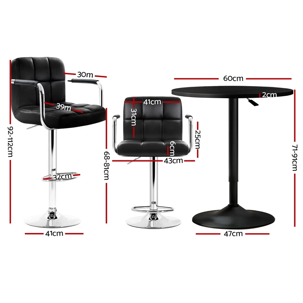 Artiss Bar Table & Stools Set - Black, Adjustable Height, 360° Swivel, MDF & Steel, Indoor/Outdoor, 1-Year Warranty