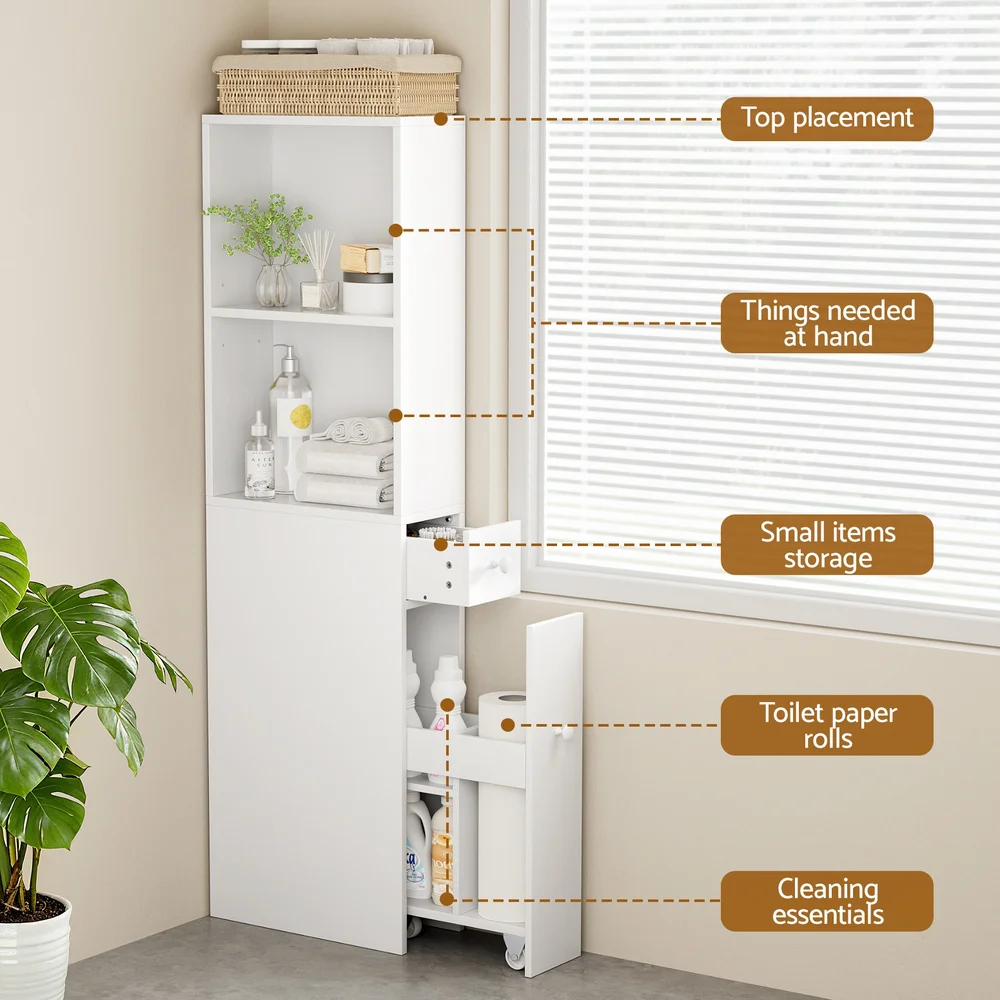 Artiss White Bathroom Cabinet 135cm – Slim Storage Organiser with Adjustable Shelves, Slide-Out Drawer & 3-Wheel Unit