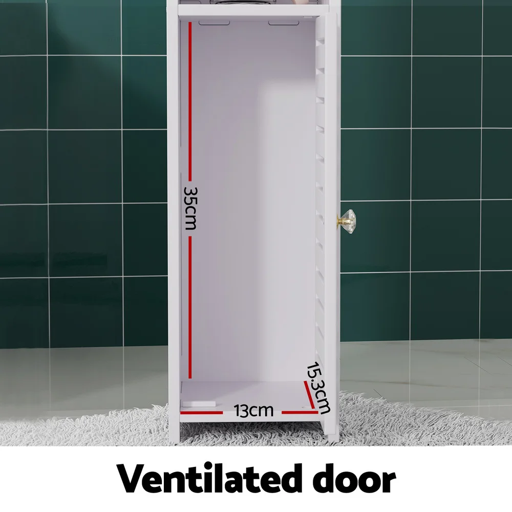 Enhance your bathroom's functionality with the Artiss Bathroom Cabinet Toilet Roll Holder Tissue Organiser. This 3-tier floor cabinet boasts a slim, space-saving design perfect for fitting into tight spaces. Crafted from water-resistant PVC, it features a convenient roll rod and a bottom cabinet with a ventilated door for storing extra toilet rolls. The top shelf offers additional storage, making it a versatile addition to any bathroom. Easy to assemble and maintain, this cabinet is your go-to solution for optimizing bathroom storage.