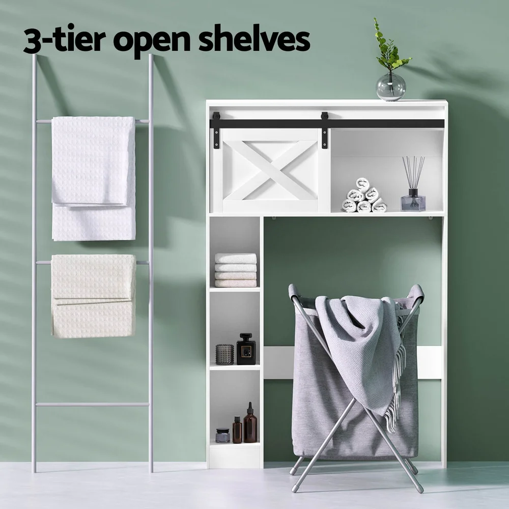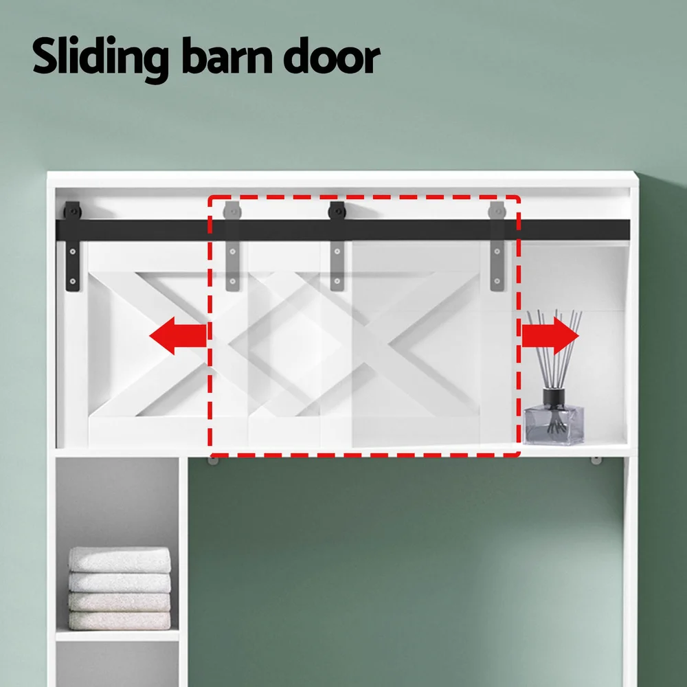 Artiss Over-Toilet Bathroom Storage Cabinet - White & Black, 128cm, Sliding Barn Door, 3 Tier Shelves, Particleboard