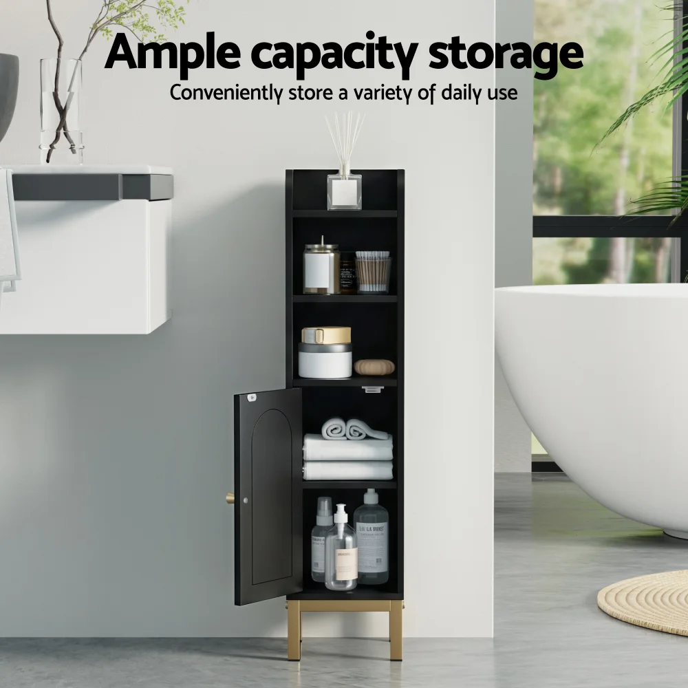 Artiss Black Bathroom Storage Cabinet - Slim 20x20x84cm, 5-Tier Organiser with Adjustable Shelf, Arched Door, Gold Legs