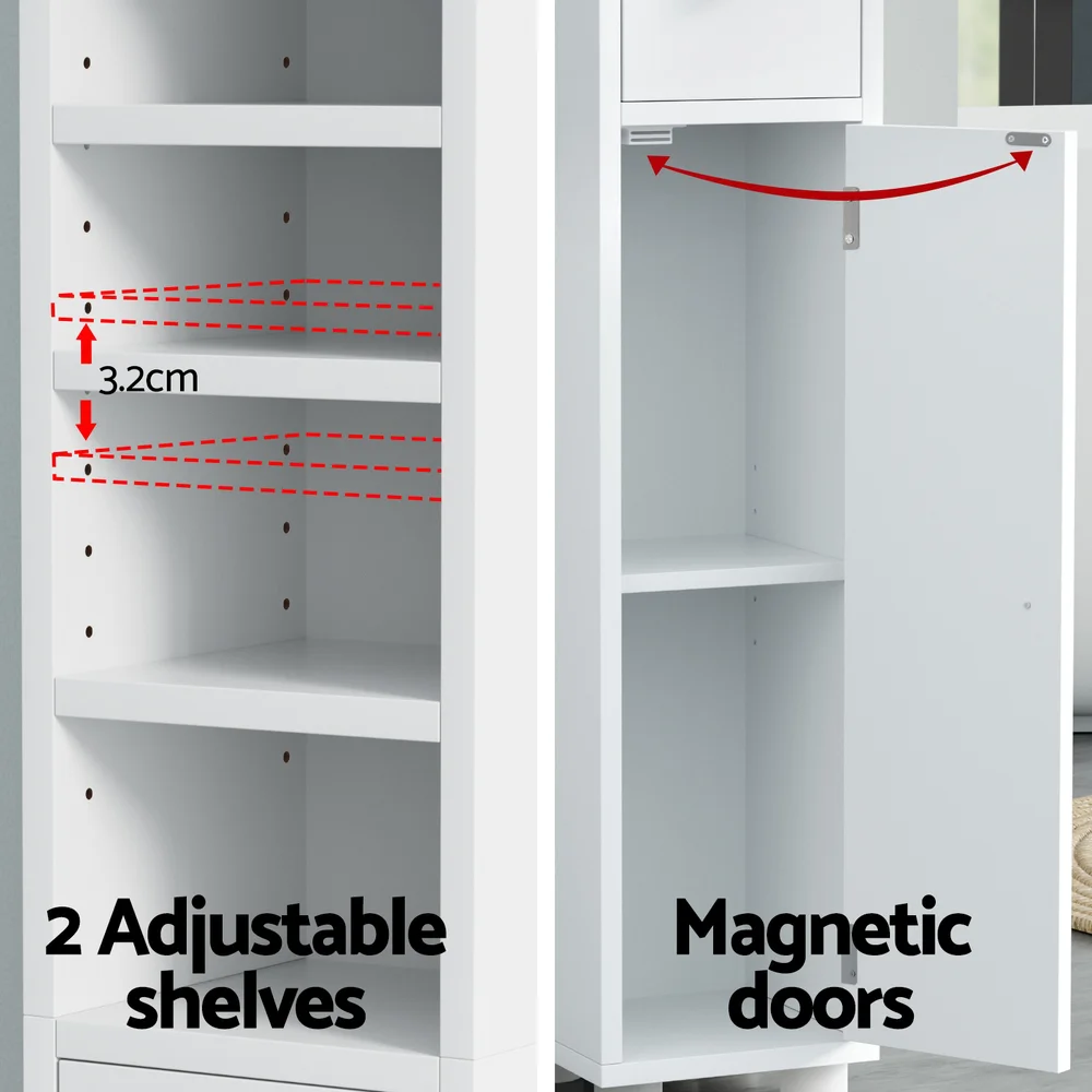 Maximise your space with the Artiss Bathroom Storage Cabinet, an elegant, slim tower designed to fit in tight spaces while offering generous storage. With two cabinets, five compartments, and a drawer, it keeps essentials organised and accessible. Crafted from durable MDF with a clean white finish, its adjustable shelves, magnetic doors with nickel handles, and anti-toppling device ensure convenience and safety. Suitable for bathrooms, bedrooms, or living areas, this cabinet blends seamlessly into any decor and is easy to maintain.