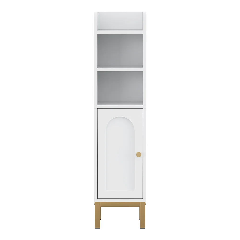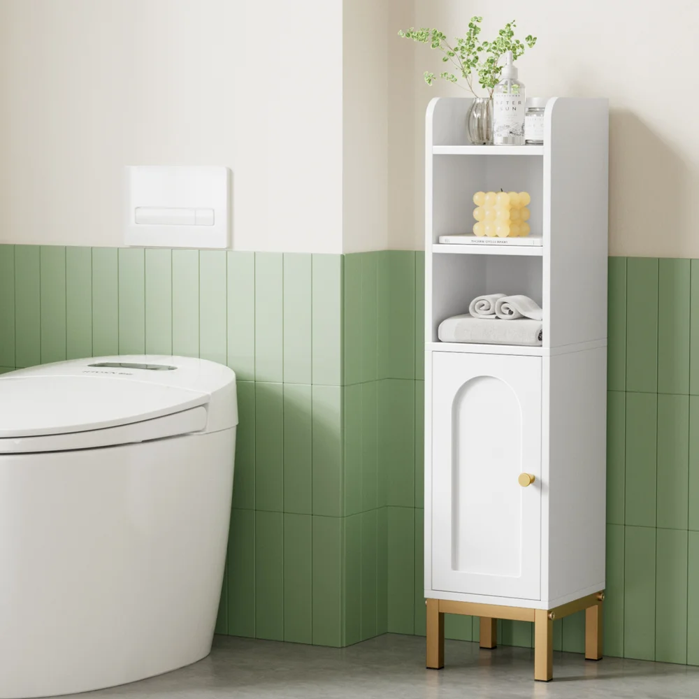 Transform your bathroom into a stylish haven with the Artiss Bathroom Storage Cabinet. This ultra-slim floor organiser is designed to maximise space in compact Australian homes, measuring just 20x20x84cm. Its elegant arched door and gold-toned legs bring a touch of boutique charm to any space. Enjoy versatile 3-tier storage: the top shelf for decorative items, an adjustable middle compartment for toiletries, and a concealed bottom cabinet for essentials. Crafted from durable MDF with reinforced metal legs, it includes an anti-tip safety kit for peace of mind. With effortless tool-free assembly, this cabinet is perfect for rentals and tight spaces, ensuring a clutter-free, curated style.