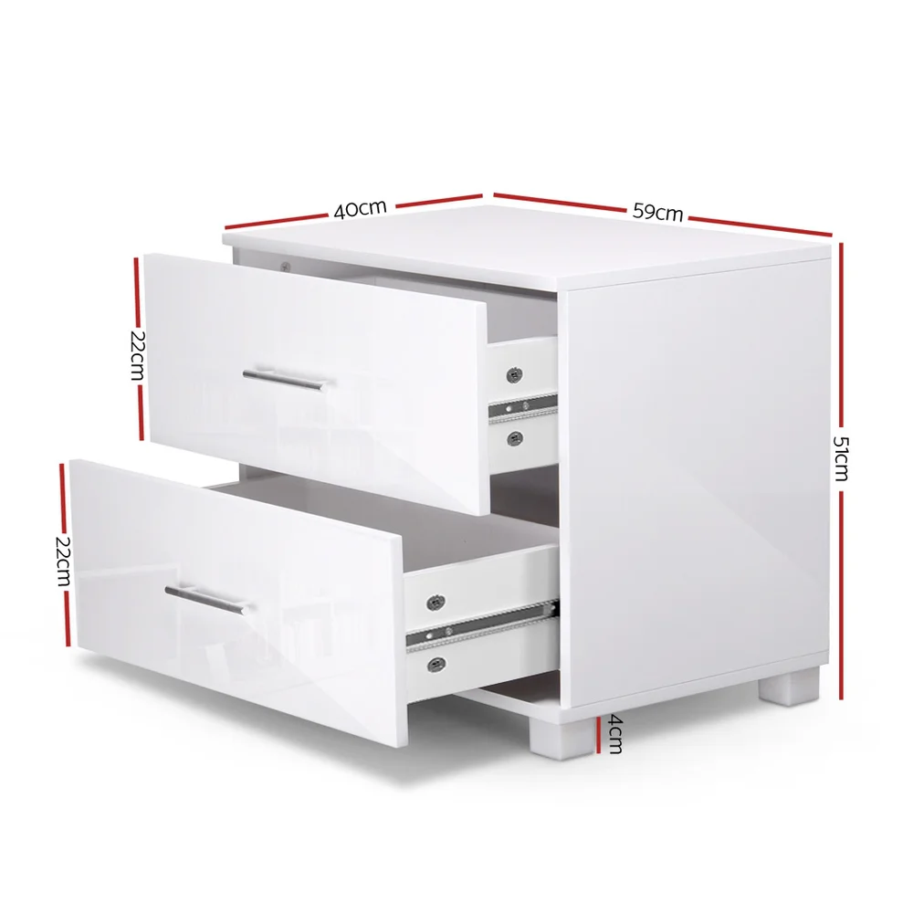 Artiss Bedside Table with 2 Drawers, MDF, High Gloss White, 59x40x51cm - Modern Design, Ample Storage, Easy Assembly