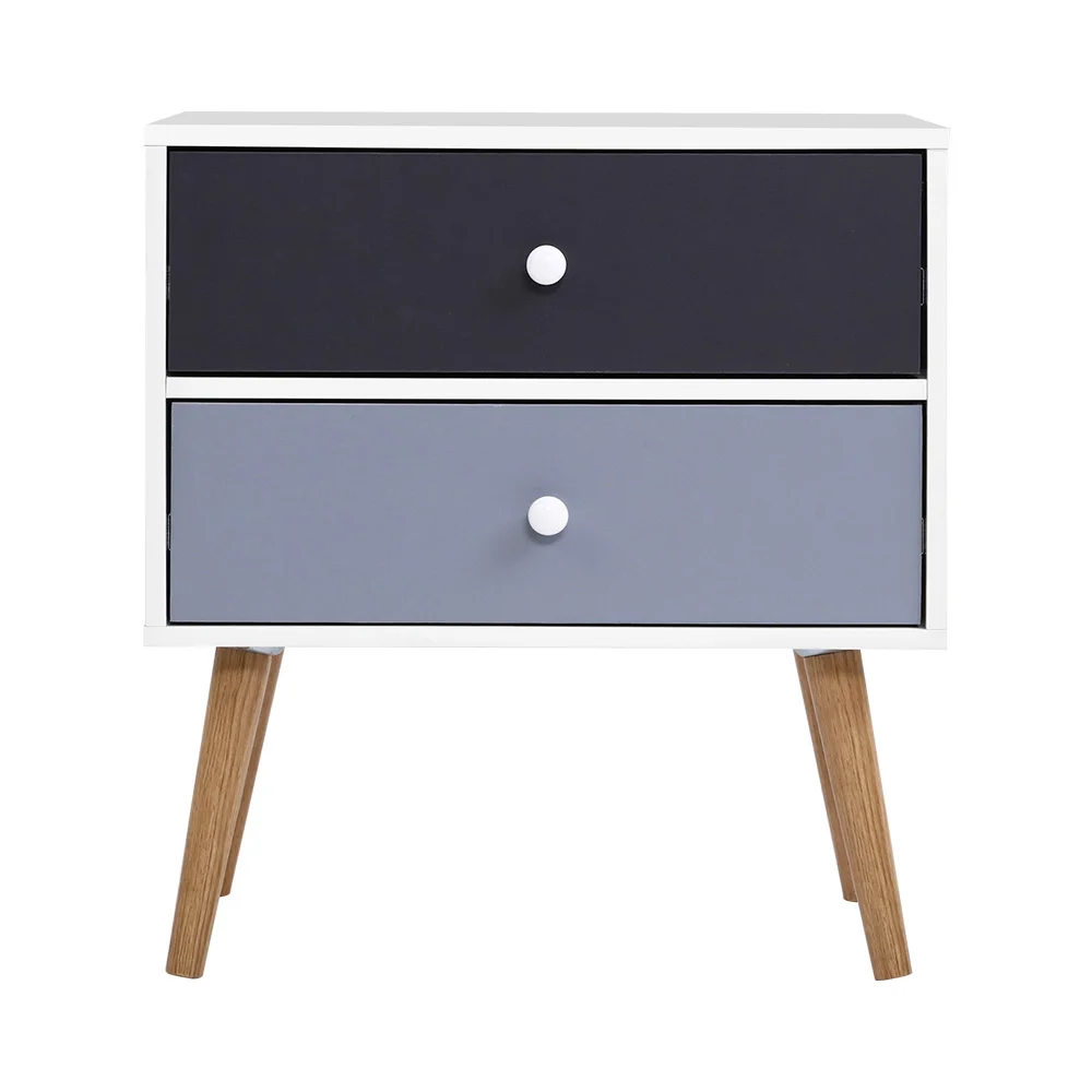 Elevate your bedroom with the Artiss Bedside Table, a Scandinavian-inspired piece with a touch of vintage charm. Crafted from quality particle board with a chic two-tone finish, it features splayed solid wood legs and classic knob handles. Enjoy ample storage with two drawers, enhanced by anti-rust metal slides for smooth operation. Perfect for any space, this table combines style and functionality effortlessly.