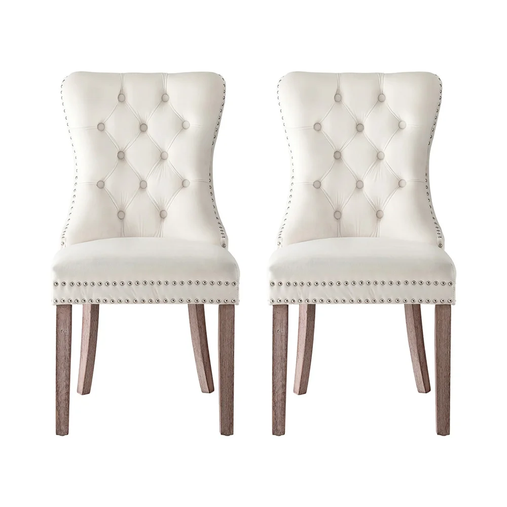 Elevate your dining experience with the Artiss Set of 2 Dining Chairs in elegant beige velvet. Boasting plush velvet upholstery, a button-tufted backrest, and sophisticated rivet edging, these chairs blend timeless style with superior comfort. The cushioned backrest is filled with high-resilience foam, while sturdy rubberwood legs and anti-slip feet ensure reliable support and lasting durability. Designed for easy assembly and everyday practicality, these chairs are a stunning addition to any dining room. Includes a 1-year warranty.