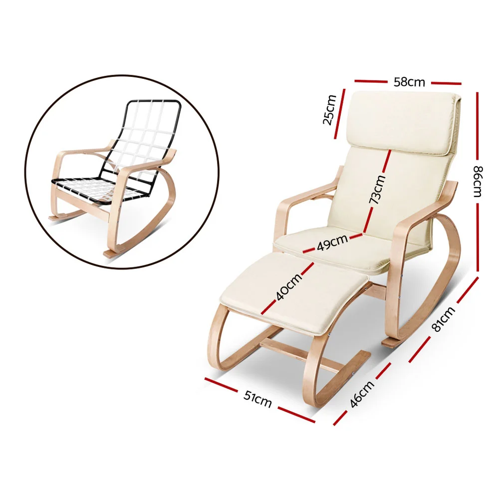 Artiss Bentwood Rocking Armchair Set with Footstool - 100% Cotton Beige Fabric, Durable Birch, High-Density Foam