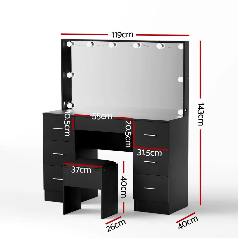 Artiss Black LED Vanity Desk Set with 10 Bulbs, 7 Drawers & Stool - 119x40x143cm, Adjustable Lighting, PU Leather Finish