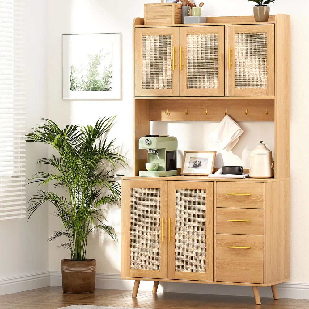 Introducing the Artiss Buffet Sideboard Hutch Storage Cabinet, a stylish and functional solution for your kitchen or dining room. Featuring elegant rattan doors, height-adjustable shelves, and a spacious countertop, this versatile cabinet provides tailored storage. It includes three smooth drawers, six extra hooks, and silent soft-closing hinges for added convenience. Built with a durable particle board frame and solid pine wood legs, it comes with an anti-tip kit for safety. The exquisite metal handles add sophistication, while the easy assembly design ensures everyday convenience. Elevate your space with this perfect blend of style and practicality!