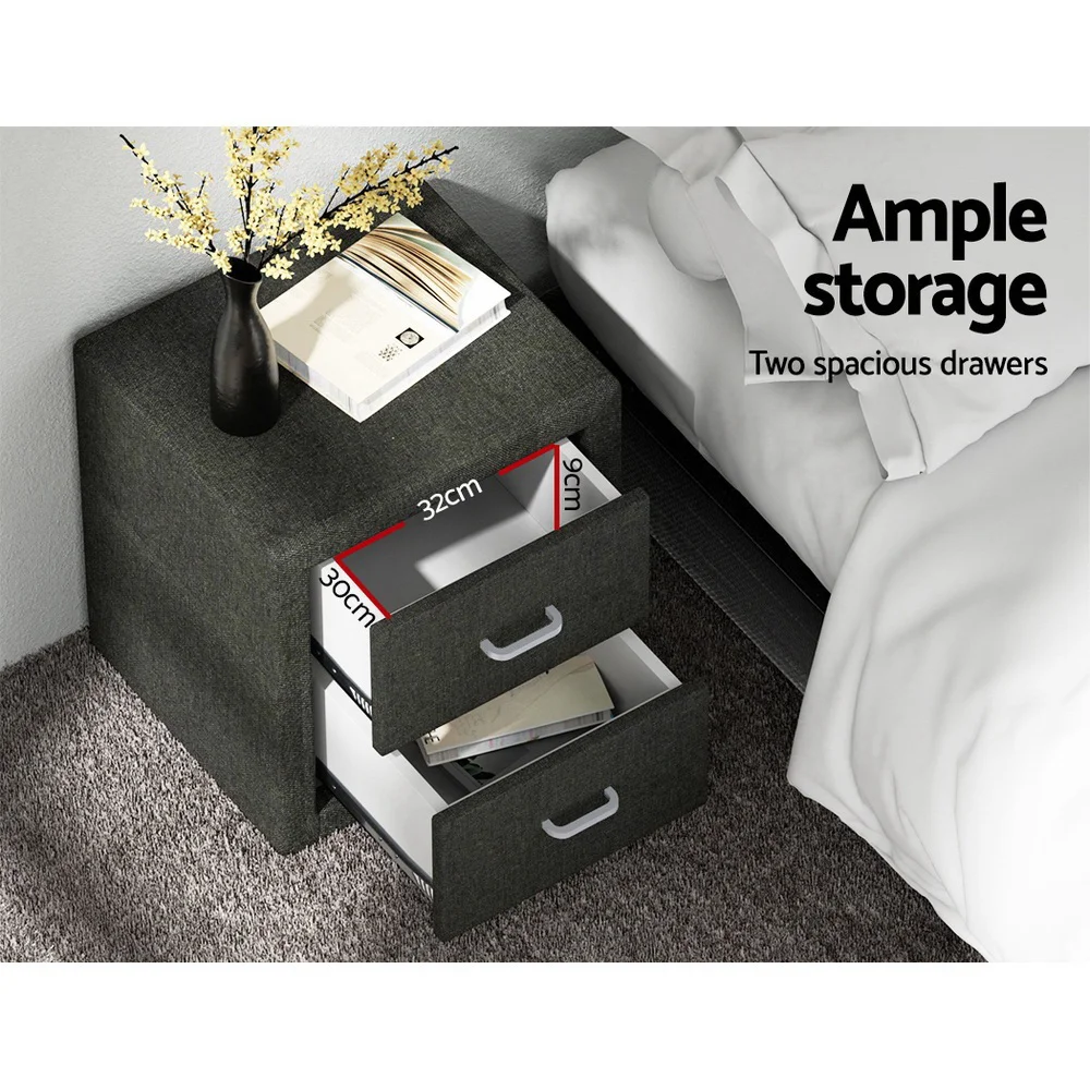 Elevate your bedroom aesthetics with the Artiss 2X Bedside Table, featuring a sleek and modern design crafted for style and functionality. Wrapped in elegant charcoal faux linen, these tables are not only visually appealing but also practical, offering two spacious drawers to keep your essentials organised. Built with a solid MDF frame and adorned with contemporary aluminium handles, the tables ensure durability and ease of use with anti-rust coated metal draw runners. Ideal for any room, they effortlessly double as chic side tables, harmonising with your contemporary home decor.