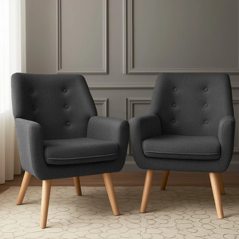 Artiss Anne 2X Armchair Set - Charcoal Faux Linen, Retro Tub Chair with Tufted Backrest, Wooden Frame, Rubber Wood Legs