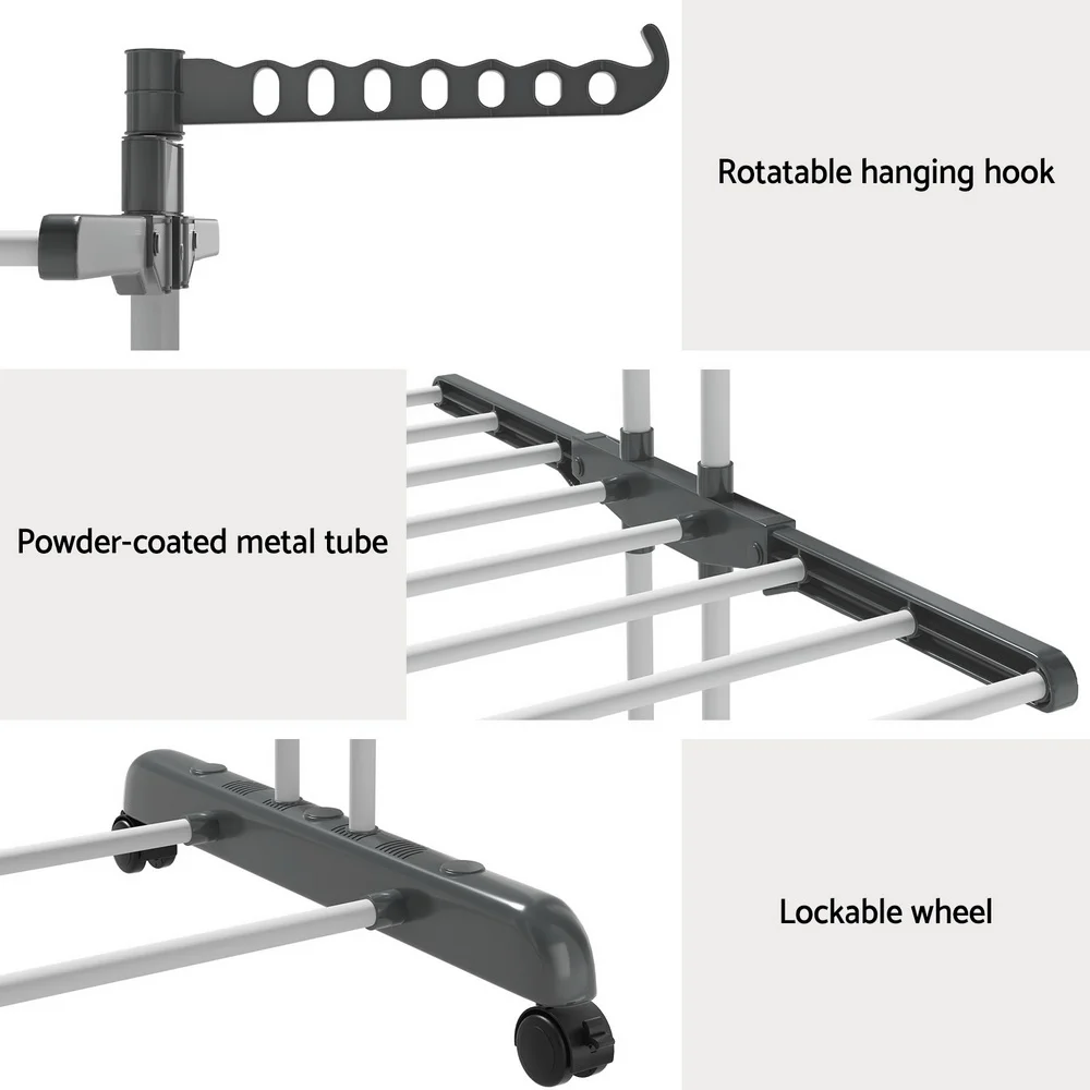 Artiss Double Rail Clothes Rack Airer - Adjustable Metal Coat Stand with Lockable Wheels, 60kg Capacity, Silver