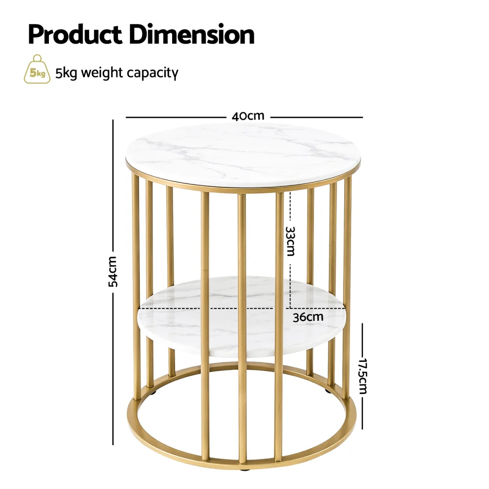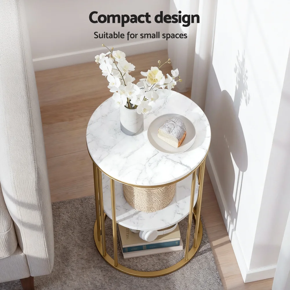 Artiss 2-Tier Round Coffee Table - White & Gold Marble Effect, E1 MDF, Metal Frame, 40x40x54cm, Easy Assembly