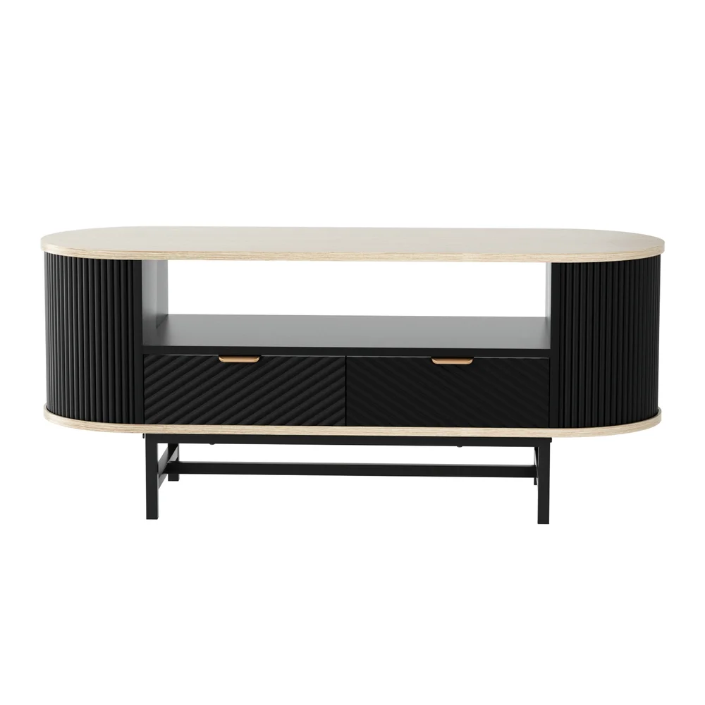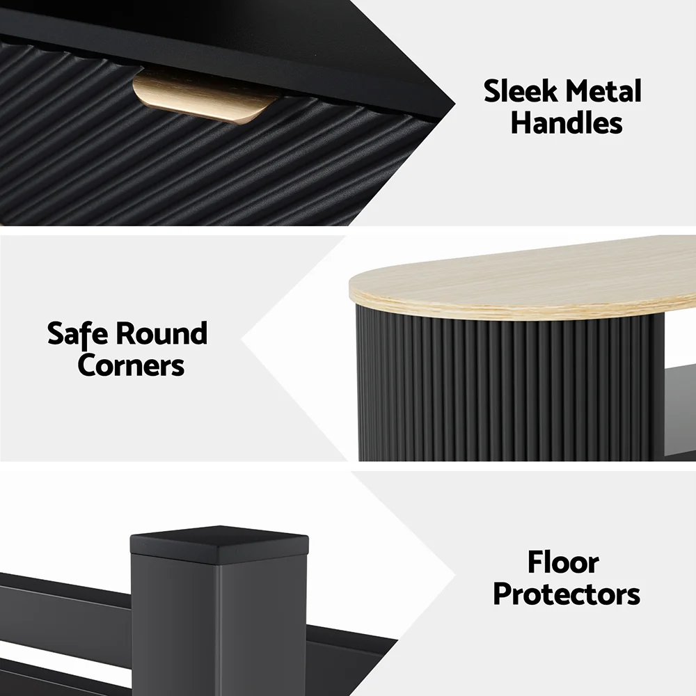 Artiss Coffee Table with Drawers and Shelf, 110cm Wood and Black, Fluted Design, MDF, Metal Handles, Modern Style