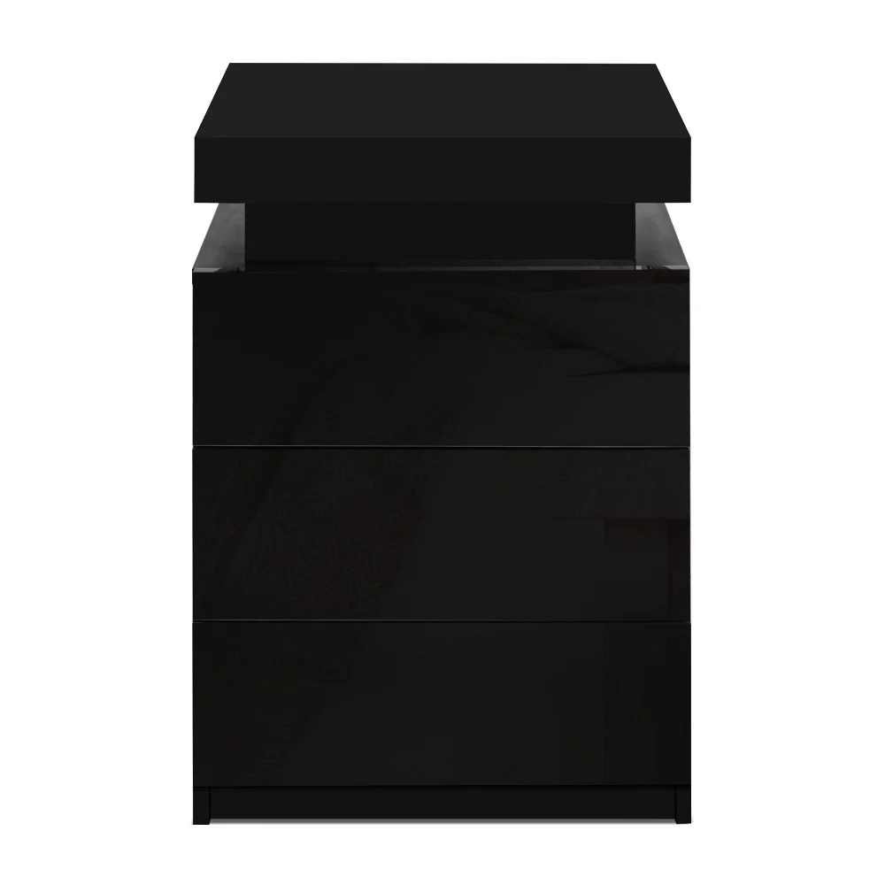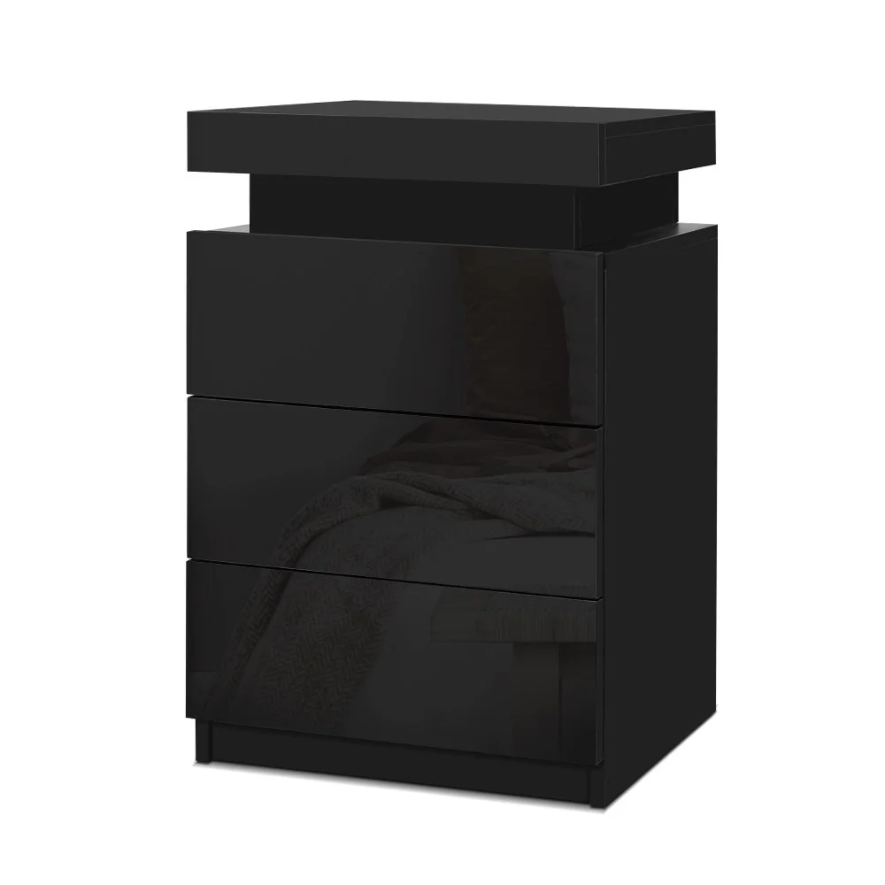 Artiss 2x LED Bedside Table with 3 Drawers, Customised 16 Colour Lights, High Gloss Black Finish, 53x35x60cm