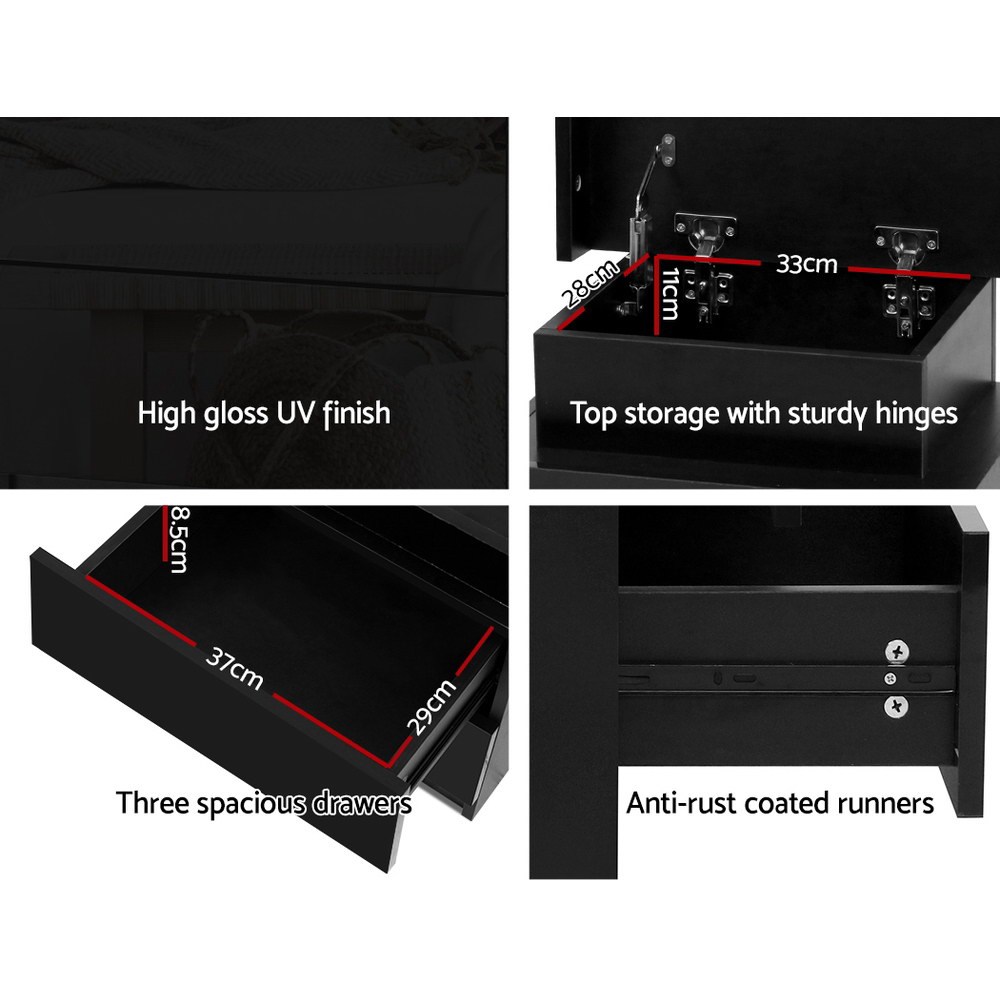 Artiss 2X Black LED Bedside Table with 3 Drawers, Lift-Up Storage, High-Gloss Finish, Customised 16-Colour Lighting